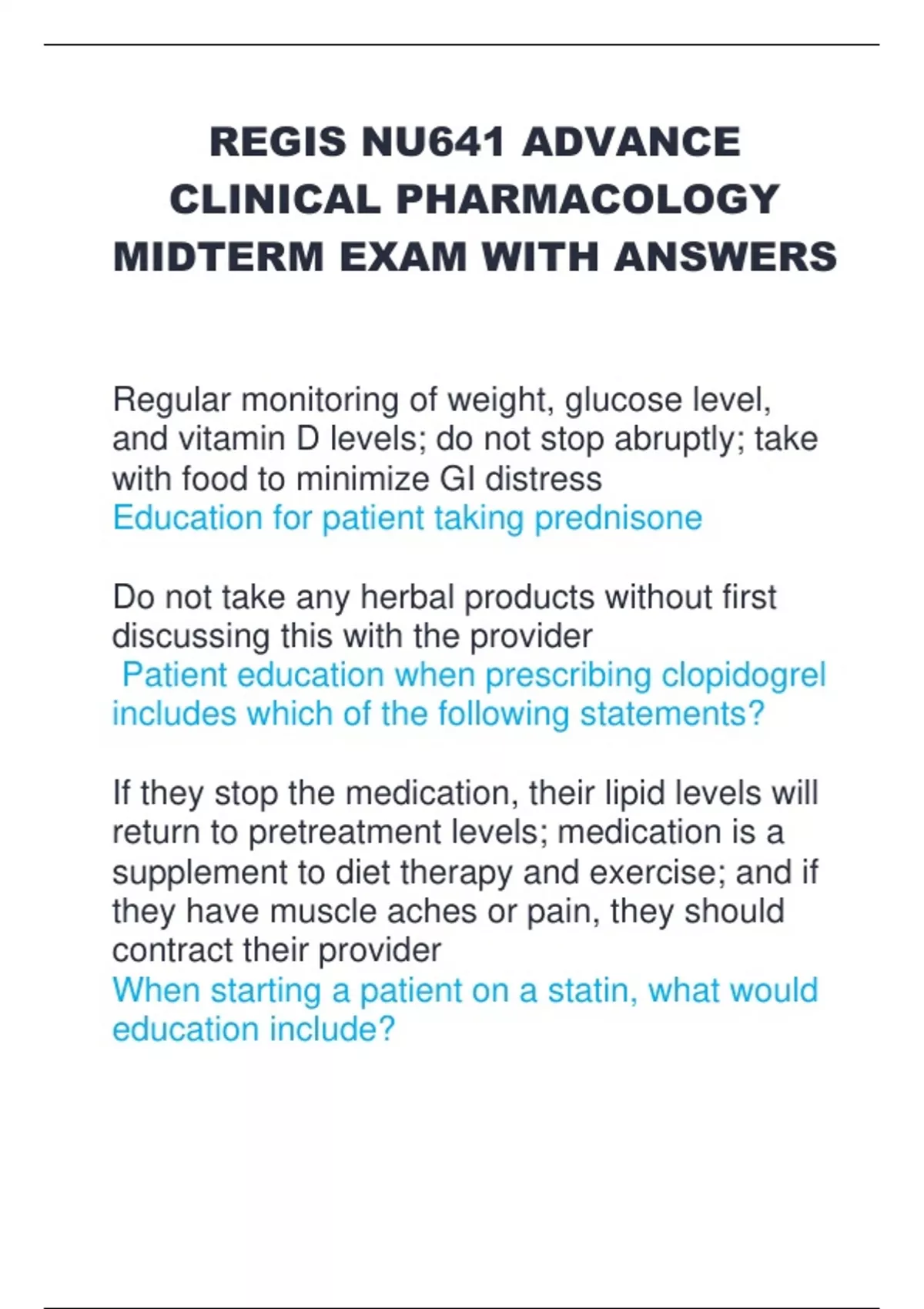 REGIS NU641 ADVANCE CLINICAL PHARMACOLOGY MIDTERM EXAM WITH ANSWERS