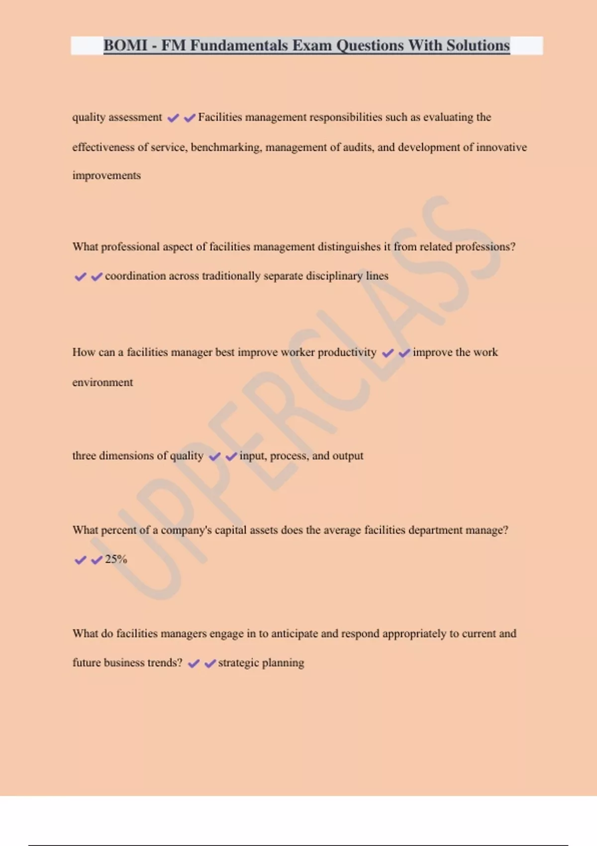 BOMI - FM Fundamentals Exam Questions With Solutions quality assessment Facilities management responsibilities such as evaluating the effectiveness of service, benchmarking, management of audits, and development of innovative improvements What professional aspect of facilities management distinguishes it from related professions? coordination across traditionally separate disciplinary lines How can a facilities manager best improve worker productivity improve the work environment