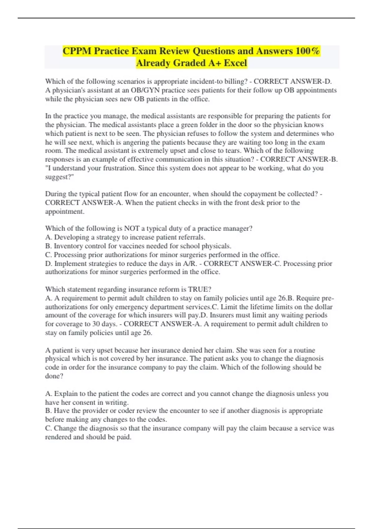 CPPM Practice Exam Review Questions and Answers 100% Already Graded A+ Excel Which of the following scenarios is appropriate incident-to billing? - CORRECT ANSWER-D. A physician's assistant at an OB/GYN practice sees patients for their follow up OB appointments while the physician sees new OB patients in the office. In the practice you manage, the medical assistants are responsible for preparing the patients for the physician. The medical assistants place a green folder in the door so the physician knows which patient is next to be seen. The physician refuses to follow the system and determines who he will see next, which is angering the patients because they are waiting too long in the exam room. The medical assistant is extremely upset and close to tears. Which of the following responses is an example of effective communication in this situation? - CORRECT ANSWER-B. "I understand your frustration. Since this system does not appear to be working, what do you suggest?" During the typical patient flow for an encounter, when should the copayment be collected? - CORRECT ANSWER-A. When the patient checks in with the front desk prior to the appointment. Which of the following is NOT a typical duty of a practice manager? A. Developing a strategy to increase patient referrals. B. Inventory control for vaccines needed for school physicals. C. Processing prior authorizations for minor surgeries performed in the office. D. Implement strategies to reduce the days in A/R. - CORRECT ANSWER-C. Processing prior authorizations for minor surgeries performed in the office. Which statement regarding insurance reform is TRUE? A. A requirement to permit adult children to stay on family policies until age 26.B. Require pre-authorizations for only emergency department services.C. Limit the lifetime limits on the dollar amount of the coverage for which insurers will pay.D. Insurers must limit any waiting periods for coverage to 30 days. - CORRECT ANSWER-A. A requirement to permit adult children to stay on family policies until age 26. A patient is very upset because her insurance denied her claim. She was seen for a routine physical which is not covered by her insurance. The patient asks you to change the diagnosis code in order for the insurance company to pay the claim. Which of the following should be done? A. Explain to the patient the codes are correct and you cannot change the diagnosis unless you have her consent in writing. B. Have the provider or coder review the encounter to see if another diagnosis is appropriate before making any changes to the codes. C. Change the diagnosis so that the insurance company will pay the claim because a service was rendered and should be paid. D. Submit an appeal for the insurance company to reconsider the claim and include a copy of the medical record for the date of service in question. - CORRECT ANSWER-B. Have the provider or coder review the encounter to see if another diagnosis is appropriate before making any changes to the codes. Which of the following sites of service must adhere to EMTALA? I. Physician office II. Ambulatory surgical center III. Emergency department IV. Intensive care unit - CORRECT ANSWER-III is correct Under OSHA, an emergency action plan should include: I. Evacuation procedures II. Fire extinguisher locations III. Emergency contacts and contact information IV. Designated meeting location V. Staff assignments and responsibilities - CORRECT ANSWER-The emergency action plan should include: • Procedures for reporting a fire or emergency • Evacuation procedures • Fire extinguisher locations • Emergency contacts and contact information • Designated meeting location • Staff assignments and responsibilities To perform CLIA waived tests, a practice must have a - CORRECT ANSWER-Certificate of Waiver A hospital provides free office space to providers who admit patients for inpatient procedures. Which law(s) does this violate? - CORRECT ANSWER-B. Anti-Kickback Law Which of the following is the best example of quality care improvement? A. Increase insurance claim submission accuracy to decrease denials. B. Flexibility in the training schedule to accommodate all employees. C. Effective communication between staff regarding sterilization of equipment. D. Monitor the no show rate to determine the cause and possible solution. - CORRECT ANSWER-C. Effective communication between staff regarding sterilization of equipment. On an income statement, which of the following expense categories would best represent a variable expense? A. Physicians salary B. Medical supplies C. Office rent D. Utilities - CORRECT ANSWER-A variable expense is one that can vary based on the volume in a clinic. Physician salary, office rent, and utilities are usually considered fixed expenses that do not vary. Medical supply costs will vary depending on the number of patients that are seen. B. As a manager, you are considering whether to purchase a new diagnostic device. The price of the device is $20,000 which will be paid in equal payments over 4 years. The average revenue you can expect per test is $40. The cost of supplies for each test is $5. Not accounting for staff costs, how many tests would need to be performed each year to break even? - CORRECT ANSWER-This is found by dividing the yearly cost of the equipment (20,000/4= 5,000) by the profit from each test performed (40-5=35). The result is 5,000 / 35 = 142.9. Therefore, 143 tests would need to be performed to cover the cost of the equipment and break even. Medical practices can operate their financials either under a cash-based accounting system or an accrual-based accounting system. Which of the following is the best advantage for using an accrual-based accounting system? - CORRECT ANSWER-The accrual method of accounting records revenues when they are earned and expenses when they have been incurred and provides a more accurate reflection of your current financial position. Cash-based accounting is generally simpler 
