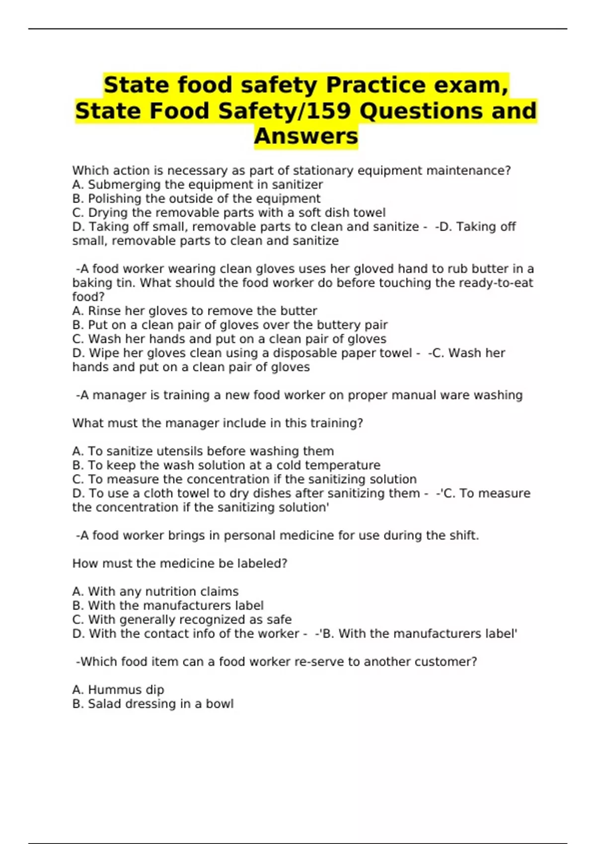 State food safety Practice exam, State Food Safety/159 Questions and Answers