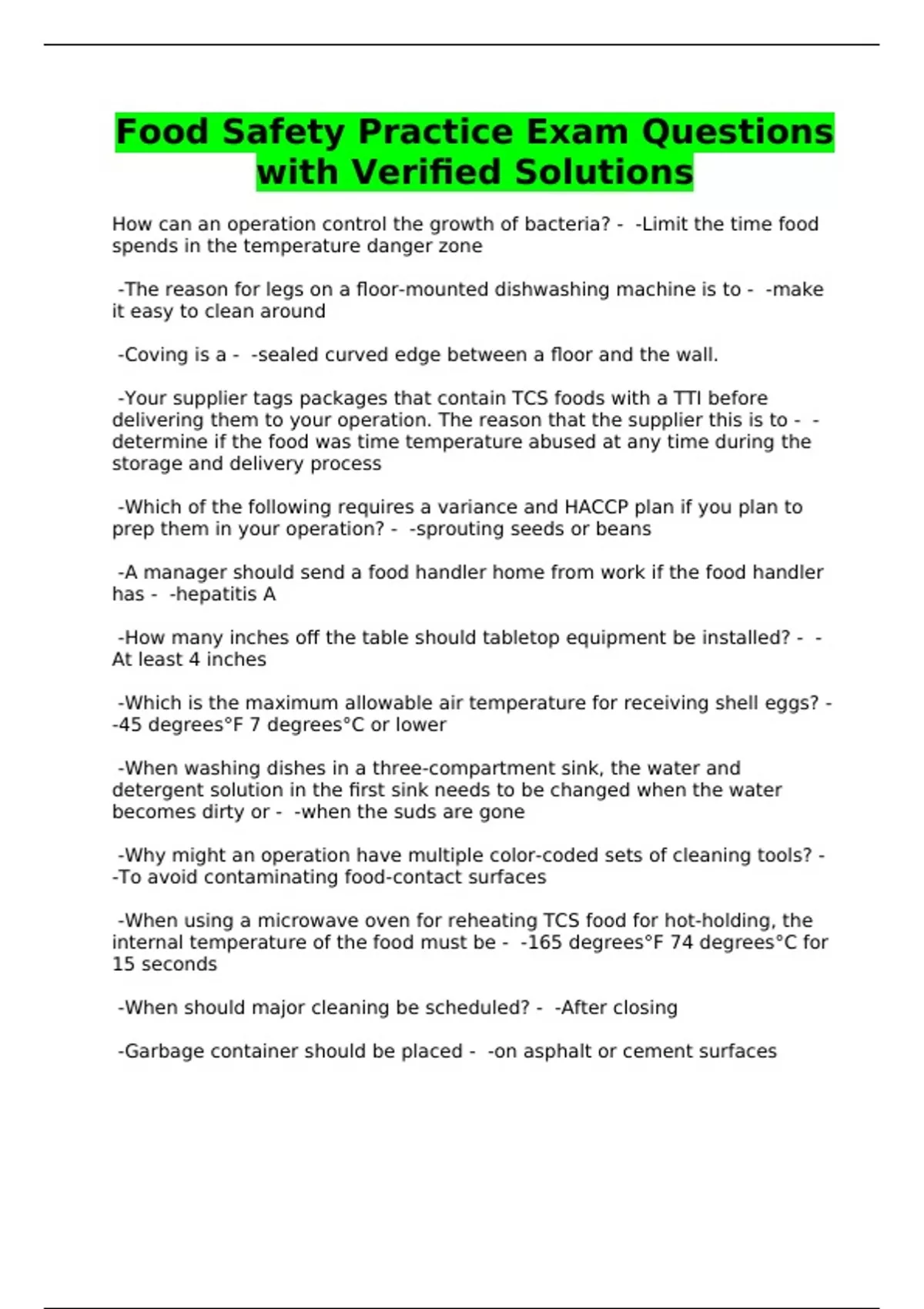 Food Safety Practice Exam Questions with Verified Solutions