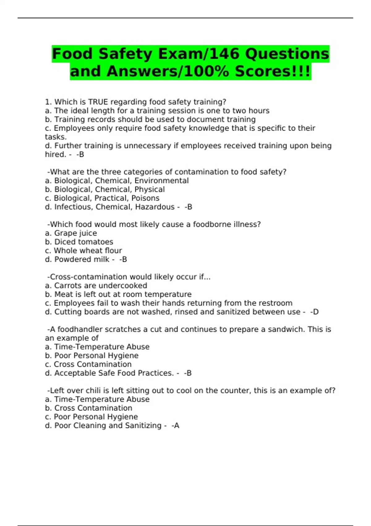 Food Safety Exam/146 Questions and Answers/100% Scores!!!