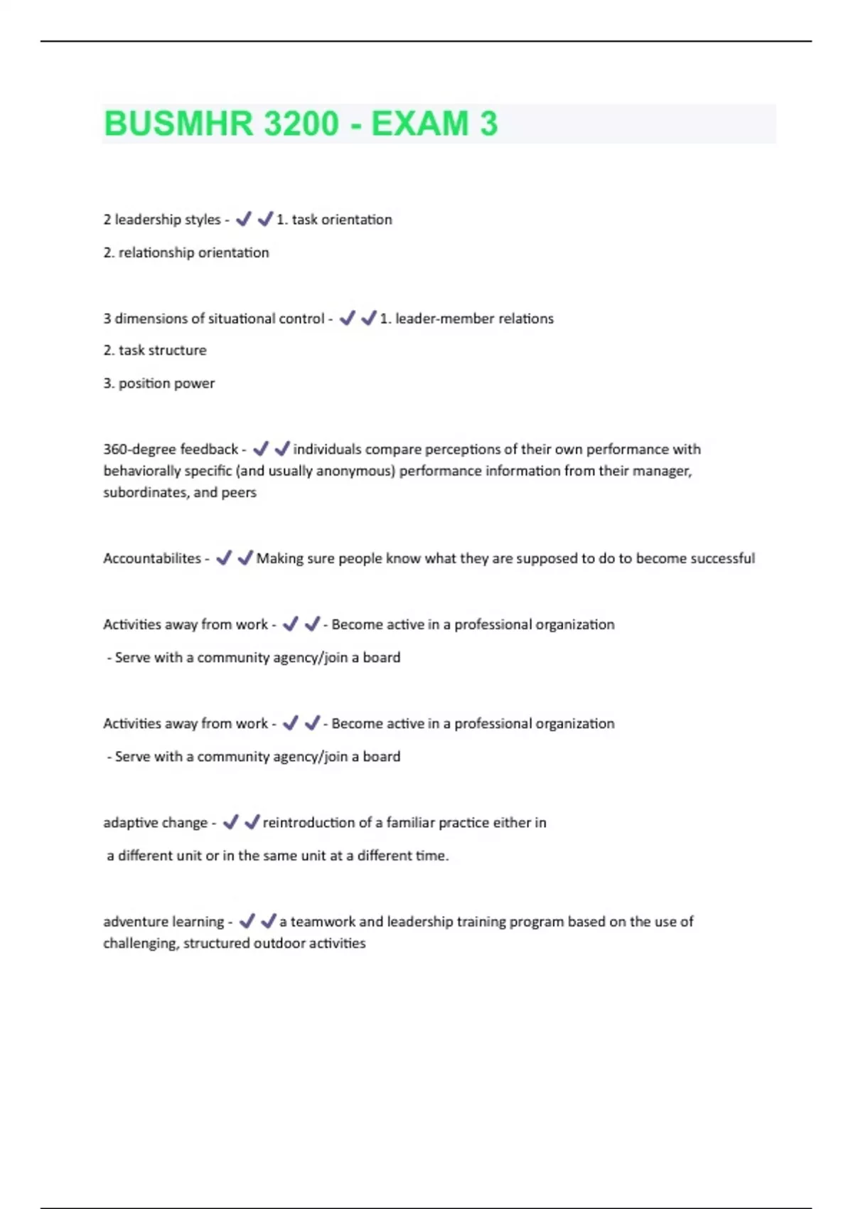 2 leadership styles - 1. task orientation 2. relationship orientation 3 dimensions of situational control - 1. leader-member relations 2. task structure 3. position power 360-degree feedback - individuals compare perceptions of their own performance with behaviorally specific (and usually anonymous) performance information from their manager, subordinates, and peers Accountabilites - Making sure people know what they are supposed to do to become successful Activities away from work - - Become active in a professional organization - Serve with a community agency/join a board Activities away from work - - Become active in a professional organization - Serve with a community agency/join a board adaptive change - reintroduction of a familiar practice either in a different unit or in the same unit at a different time. adventure learning - a teamwork and leadership training program based on the use of challenging, structured outdoor activitiesApproaches to Performance Evaluation - Ranking Forced distribution Graphic rating scales Critical incidents Behaviorally anchored rating scales (BARS) Result vs Accountability Calibration Assessing "What" vs. "How" - 1.Value driven low performers -Low performer but fits well within org 2. Poor performers -Get rid of them, doesnt fit within org and doesnt produce results 3. Loose cannons -PROBLEM, getting results but does not fit in within organization 4. Star performers - great results and live the competencies Assessment - collecting information and providing feedback to employees about their behavior, communication style, or skills Assignments for Development in place - Small projects and start ups Small scope jumps and fix its Small strategic assignments Coursework and coaching assignments Activities away from work Authentic Leadership - -They understand from their life story-They are self-aware -They practice their values and principles -They recognize both their intrinsic and extrinsic motivation -They have a balanced life and stay grounded. Behavioral Observation Scale (BOS) - a variation of a BARS which uses all behaviors necessary for effective performance to rate performance at a task behavioral theories of leadership - 1. The Ohio State leadership studies -Some of the first leadership studies at OSU - People and task behaviors found no "best style" 2. University of Michigan : -Task/PPL behavior found similar results as OSU 3. Managerial Grid -Concern for people and concern for production - 2x2 Matrix with 5 leadership styles *FOUND TEAM MANAGEMENT IS BEST STYLE*