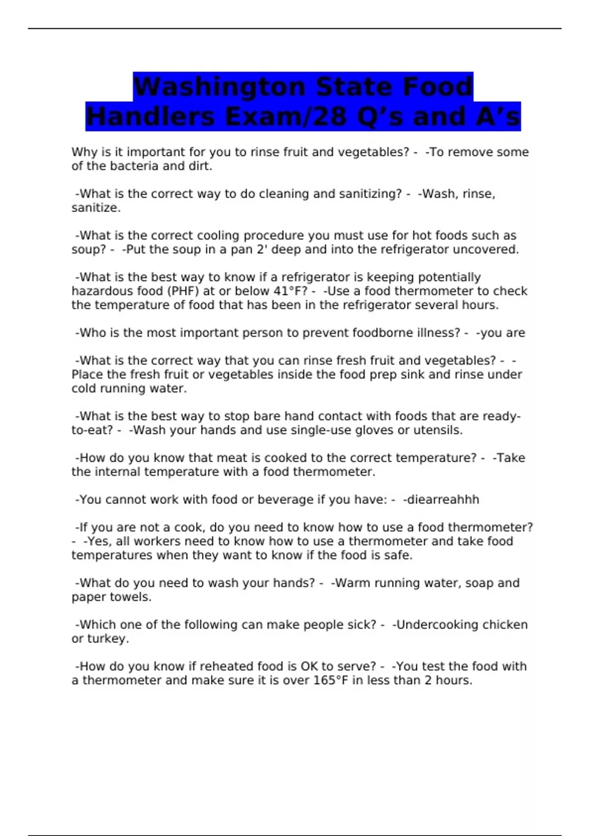 Washington State Food Handlers Exam/28 Q’s and A’s