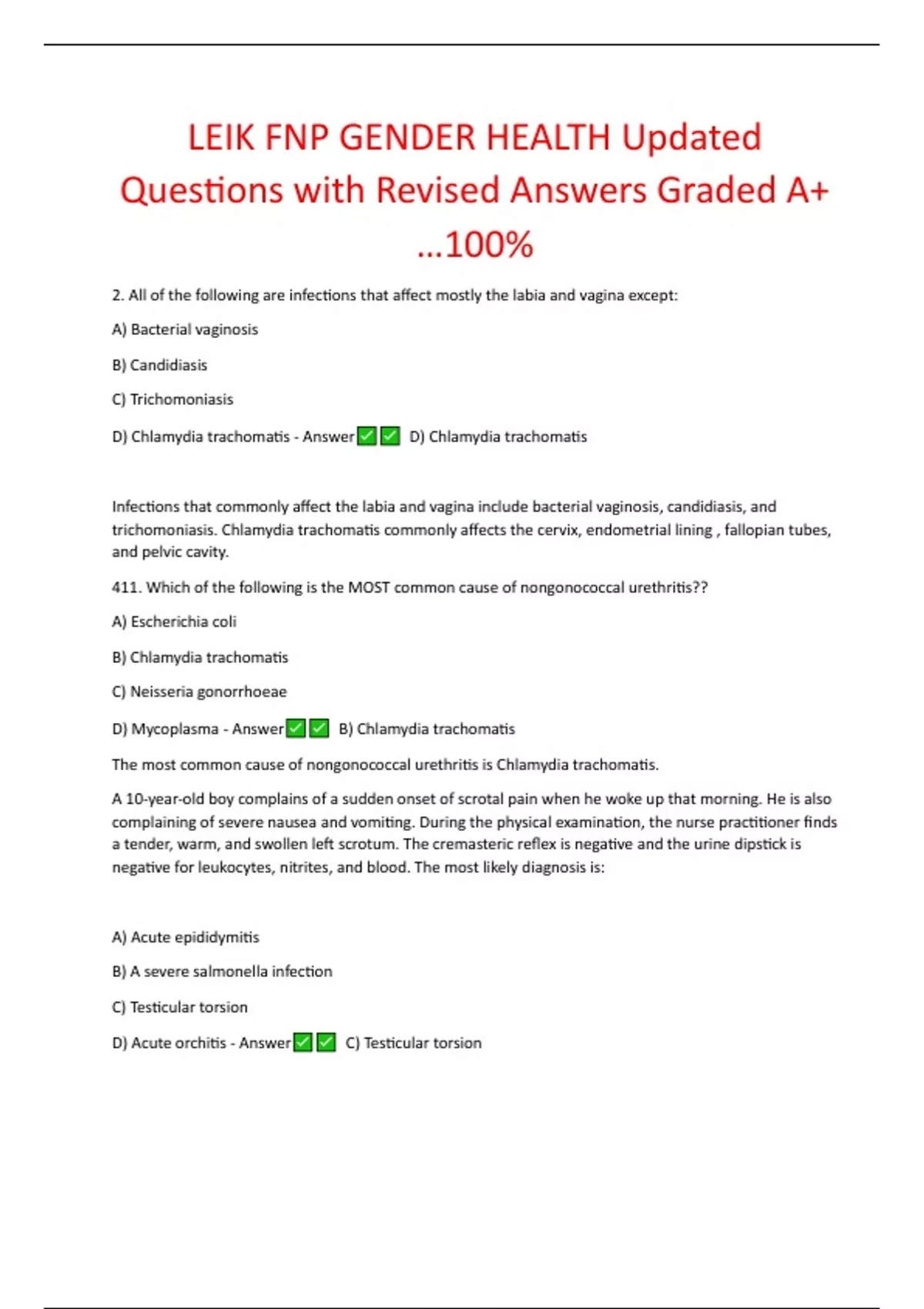 FNP Leik System Review, screening, FNP Leik System Review Questions with Correct solutions 100% __ __ is a common viral rash that is caused by human herpes virus; the most common ages of onset are btw 6 mo and 2 yrs. The rashes are maculopapular and appear first on the trunk then spread to the extremities. - Answer Roseola infantum ____ and ___ are unique findings in iron deficiency anemia - Answer Pica and koilonychia (spoonshaped nails) _____ is gold standard for cartilage, menisci, tendons, ligaments or any joint of the body - Answer MRI _____ is gold standard for cartilage, menisci, tendons, ligaments or any joint of the body - Answer MRI _____ should be used in the first 48 hrs of a sprain/strain? - Answer Ice not heat _____ should be used in the first 48 hrs of a sprain/strain? - Answer Ice not heat (RICE) ______ and ______ hormones aid to reabsorb water back into the body - Answer aldosterone and antidiuretic hormone ______ and ______ hormones aid to reabsorb water back into the body - Answer aldosterone and antidiuretic hormone ________ colored sputum is found in S. pneumoniae - Answer Rust ________ colored sputum is found in S. pneumoniae - Answer Rust ________ is compressed by the swelling of the carpal tunnel - Answer Median nerve ________ is compressed by the swelling of the carpal tunnel - Answer Median nerve (affects first 3 fingers) _________ is a more sensitive test than the serum creatinine alone because it reflects the renal function within a 24hr period. - Answer Creatinine clearance is relatively constant and is not affected by fluid status, diet, or exercise. _________ is a more sensitive test than the serum creatinine alone because it reflects the renal function within a 24hr period. - Answer Creatinine clearance is relatively constant and is not affected by fluid status, diet, or exercise. _________ is difficulty initiating and executing voluntary movement patterns necessary to produce speech when there is no paralysis or weakness of speech muscles. - Answer Apraxia of speech (verbal apraxia _________ is difficulty initiating and executing voluntary movement patterns necessary to produce speech when there is no paralysis or weakness of speech muscles. - Answer Apraxia of speech (verbal apraxia) _________ is the end product of creatine metabolism, which comes mostly from _______? - Answer Creatinine; comes mostly from muscles _________ is the end product of creatine metabolism, whick comes mostly from _______? - Answer Creatinine; comes mostly from muscles