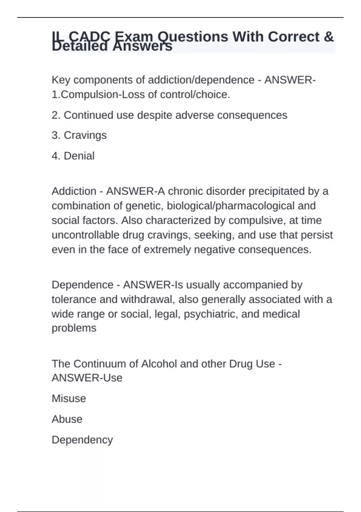 Key components of addiction/dependence - ANSWER-1.Compulsion-Loss of control/choice. 2. Continued use despite adverse consequences 3. Cravings 4. Denial Addiction - ANSWER-A chronic disorder precipitated by a combination of genetic, biological/pharmacological and social factors. Also characterized by compulsive, at time uncontrollable drug cravings, seeking, and use that persist even in the face of extremely negative consequences. Dependence - ANSWER-Is usually accompanied by tolerance and withdrawal, also generally associated with a wide range or social, legal, psychiatric, and medical problems The Continuum of Alcohol and other Drug Use - ANSWER-Use Misuse Abuse Dependency
