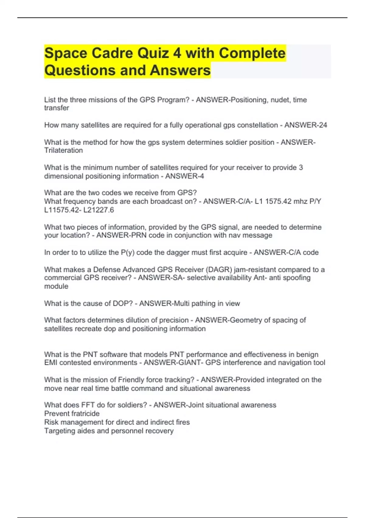 Space Cadre Quiz 4 with Complete Questions and Answers Space Cadre Quiz 4 with Complete Questions and Answers Space Cadre Quiz 4 with Complete Questions and Answers Space Cadre Quiz 4 with Complete Questions and Answers List the three missions of the GPS Program? - ANSWER-Positioning, nudet, time transfer How many satellites are required for a fully operational gps constellation - ANSWER-24 What is the method for how the gps system determines soldier position - ANSWER-Trilateration