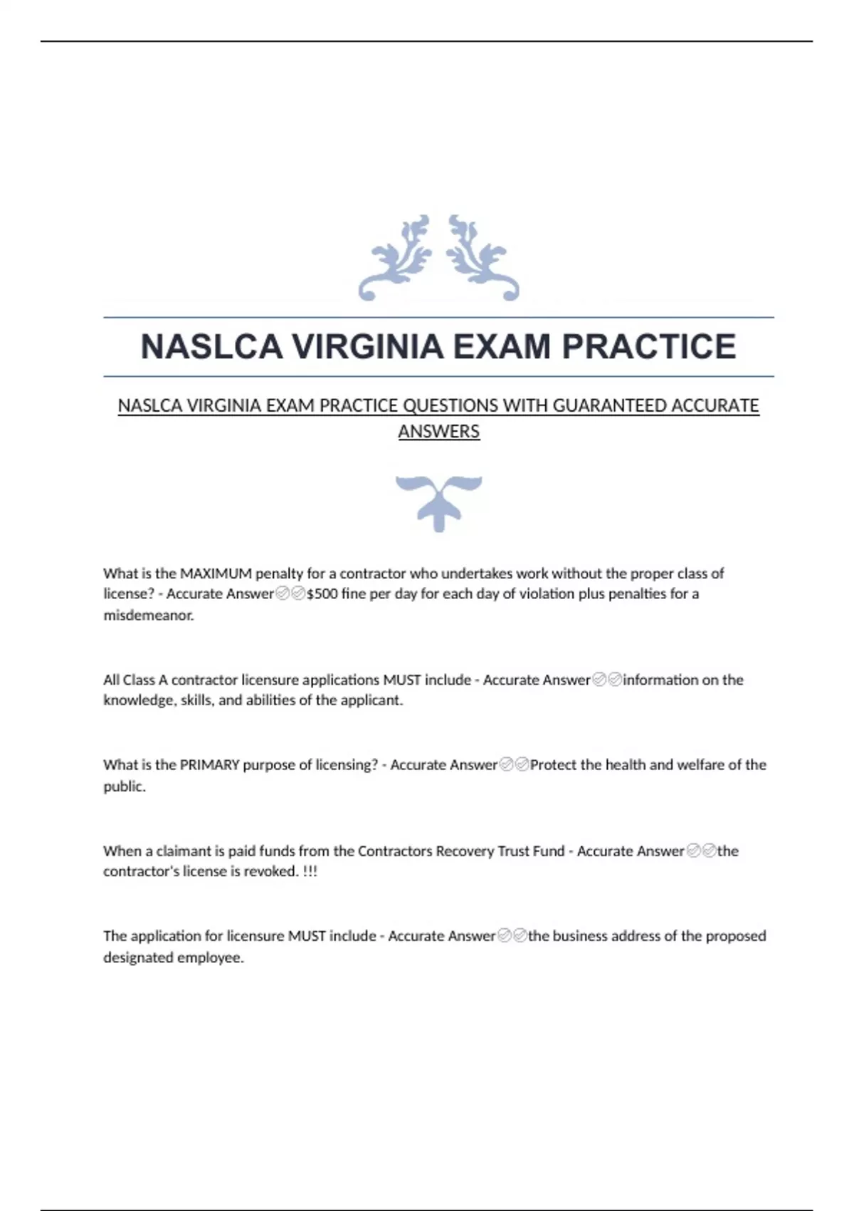 NASLCA VIRGINIA EXAM PRACTICE NASLCA VIRGINIA EXAM PRACTICE QUESTIONS WITH GUARANTEED ACCURATE ANSWERS What is the MAXIMUM penalty for a contractor who undertakes work without the proper class of license? - Accurate Answer$500 fine per day for each day of violation plus penalties for a misdemeanor. All Class A contractor licensure applications MUST include - Accurate Answerinformation on the knowledge, skills, and abilities of the applicant. What is the PRIMARY purpose of licensing? - Accurate AnswerProtect the health and welfare of the public. When a claimant is paid funds from the Contractors Recovery Trust Fund - Accurate Answerthe contractor's license is revoked. !!! The application for licensure MUST include - Accurate Answerthe business address of the proposed designated employee. Which of the following is a requirement for a joint venture? - Accurate AnswerEither the joint venture or each contracting party of the joint venture must be licensed. All of the following must be licensed EXCEPT - Accurate Answera material supplier who advises a contractor. How much is the Class A initial license fee? - Accurate Answer$200 A licensee's name change MUST be reported to the Board within a MAXIMUM of how many days? - Accurate Answer30 days According to the Board Rules and Regulations, a full-time employee is one who works a MINIMUM of how many hours per week? - Accurate Answer30 hours. A firm desiring to be licensed as a Class B contractor MUST have a MINIMUM net worth of - Accurate Answer$15,000. According to the Board Rules and Regulations, which of the following could be a qualified individual? - Accurate AnswerAny full-time employee.