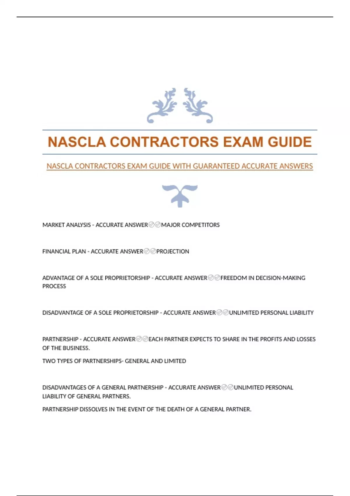 NASCLA CONTRACTORS EXAM GUIDE NASCLA CONTRACTORS EXAM GUIDE WITH GUARANTEED ACCURATE ANSWERS MARKET ANALYSIS - ACCURATE ANSWERMAJOR COMPETITORS FINANCIAL PLAN - ACCURATE ANSWERPROJECTION ADVANTAGE OF A SOLE PROPRIETORSHIP - ACCURATE ANSWERFREEDOM IN DECISION-MAKING PROCESS DISADVANTAGE OF A SOLE PROPRIETORSHIP - ACCURATE ANSWERUNLIMITED PERSONAL LIABILITY PARTNERSHIP - ACCURATE ANSWEREACH PARTNER EXPECTS TO SHARE IN THE PROFITS AND LOSSES OF THE BUSINESS. TWO TYPES OF PARTNERSHIPS- GENERAL AND LIMITED DISADVANTAGES OF A GENERAL PARTNERSHIP - ACCURATE ANSWERUNLIMITED PERSONAL LIABILITY OF GENERAL PARTNERS. PARTNERSHIP DISSOLVES IN THE EVENT OF THE DEATH OF A GENERAL PARTNER. PURPOSE OF LICENSING - ACCURATE ANSWERA MAJOR PURPOSE OF LICENSING IS TO PROTECT THE HEALTH, SAFETY, AND WELFARE OF THE PUBLIC VA BOARD FOR CONTRACTORS - ACCURATE ANSWER7 LICENSED CONTRACTOR MEMBERS LICENSING REQUIREMENTS: EXEMPTIONS - ACCURATE ANSWERANY MATERIAL SUPPLIER CLASS A - ACCURATE ANSWERSINGLE CONTRACT - $120,000 OR MORE 12-MONTH - $750,000 OR MORE LICENSE CLASSES ARE DETERMINED BY - ACCURATE ANSWERNET WORTH CLASS A CLASS B -