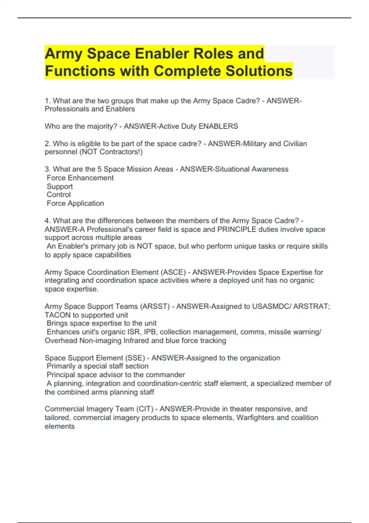 Army Space Enabler Roles and Functions with Complete SolutionsArmy Space Enabler Roles and Functions with Complete SolutionsArmy Space Enabler Roles and Functions with Complete SolutionsArmy Space Enabler Roles and Functions with Complete Solutions 1. What are the two groups that make up the Army Space Cadre? - ANSWER-Professionals and Enablers Who are the majority? - ANSWER-Active Duty ENABLERS 2. Who is eligible to be part of the space cadre? - ANSWER-Military and Civilian personnel (NOT Contractors!)