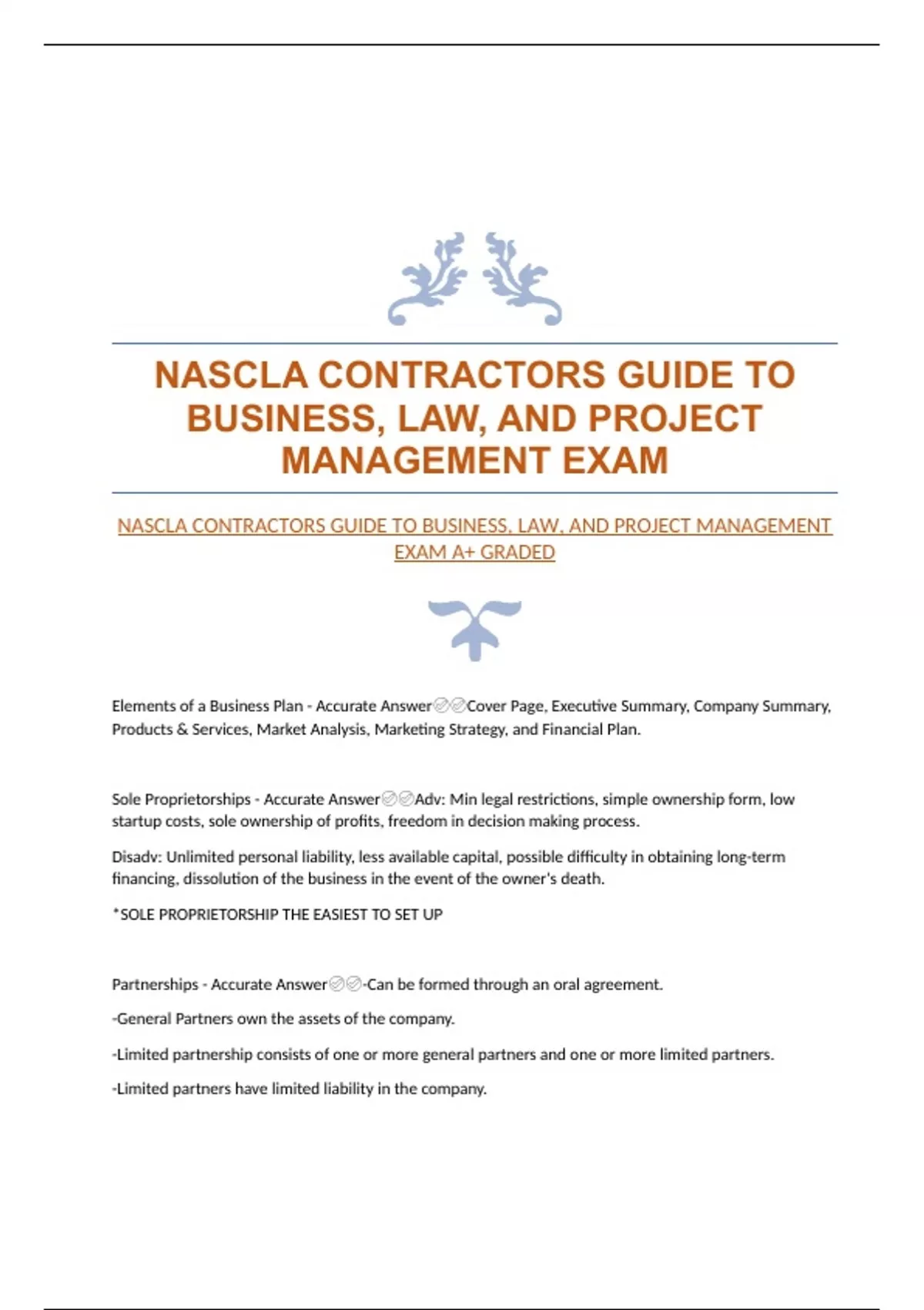 Elements of a Business Plan - Accurate Answer ✅✅Cover Page, Executive Summary, Company Summary, Products & Services, Market Analysis, Marketing Strategy, and Financial Plan.