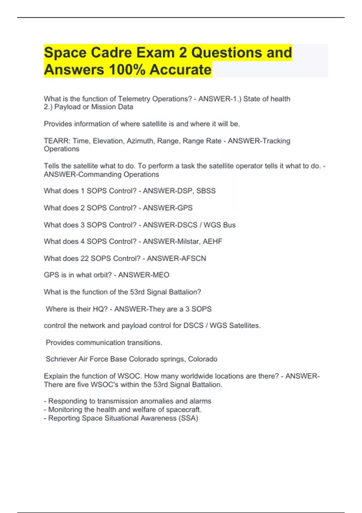 Space Cadre Exam 2 Questions and Answers 100% AccurateSpace Cadre Exam 2 Questions and Answers 100% AccurateSpace Cadre Exam 2 Questions and Answers 100% AccurateSpace Cadre Exam 2 Questions and Answers 100% AccurateWhat is the function of Telemetry Operations? - ANSWER-1.) State of health 2.) Payload or Mission Data Provides information of where satellite is and where it will be. TEARR: Time, Elevation, Azimuth, Range, Range Rate - ANSWER-Tracking Operations Tells the satellite what to do. To perform a task the satellite operator tells it what to do. - ANSWER-Commanding Operations