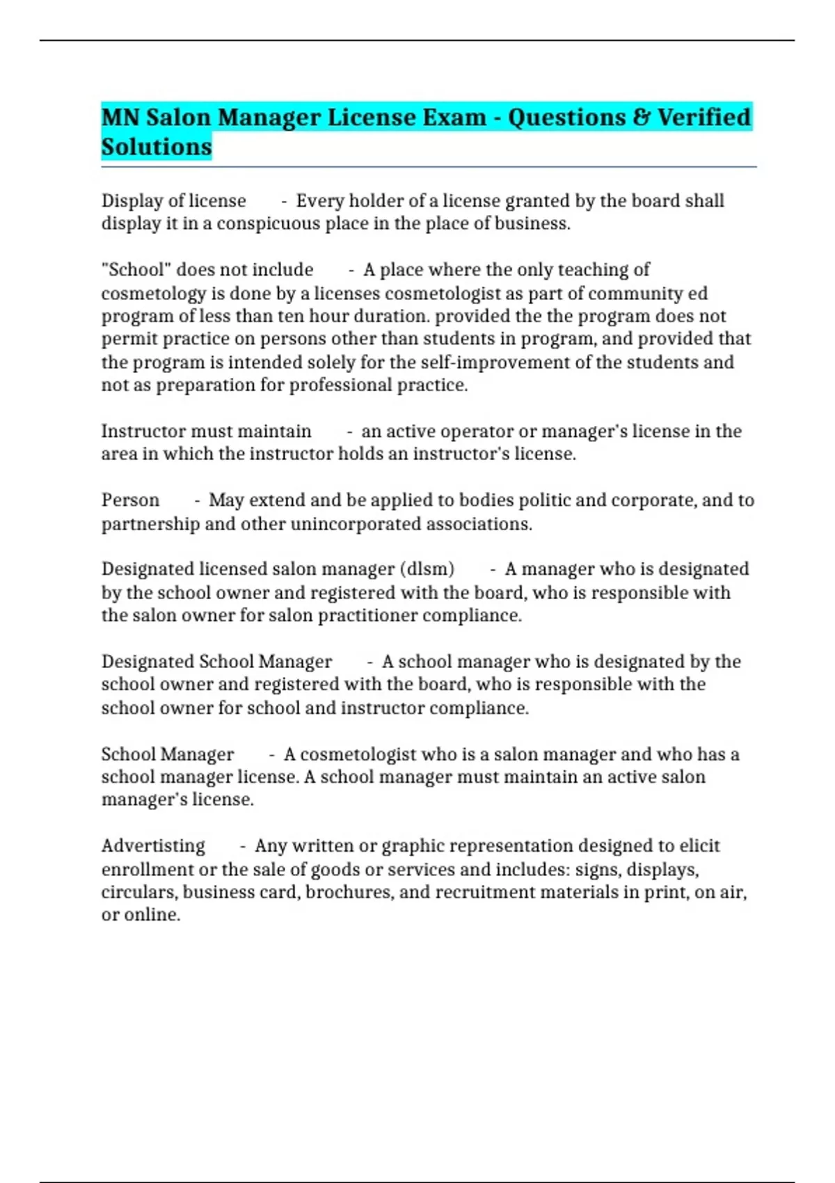 MN Salon Manager License Exam - Questions & Verified Solutions