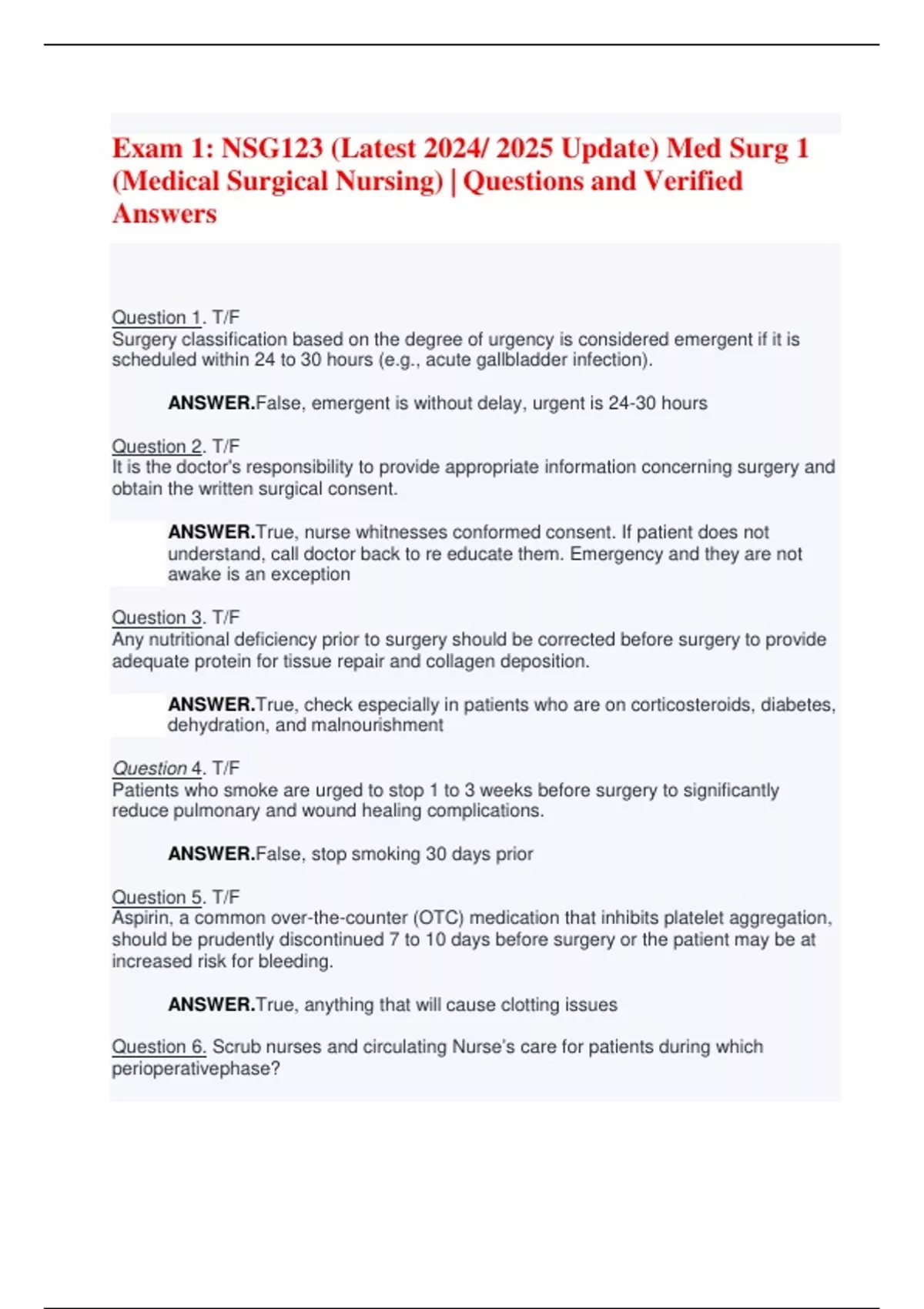 Exam 1: NSG123 (Latest 2024/ 2025 Update) Med Surg 1