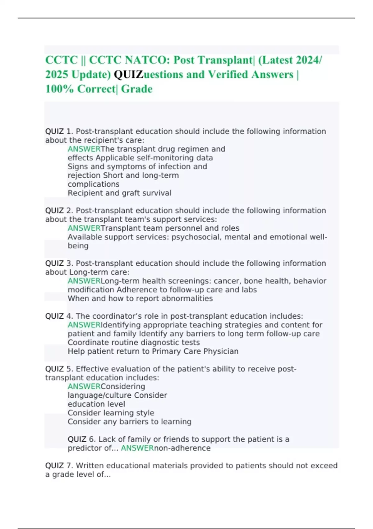CCTC || CCTC NATCO: Post Transplant| (Latest 2024/ 2025 Update) QUIZuestions and Verified Answers | 100%Correct| Grade A+