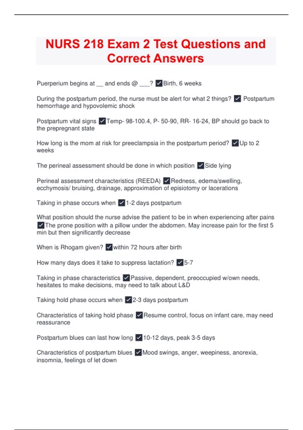 Puerperium begins at __ and ends @ ___? Birth, 6 weeks During the postpartum period, the nurse must be alert for what 2 things? Postpartum hemorrhage and hypovolemic shock Postpartum vital signs Temp- 98-100.4, P- 50-90, RR- 16-24, BP should go back to the prepregnant state How long is the mom at risk for preeclampsia in the postpartum period? Up to 2 weeks The perineal assessment should be done in which position Side lying Perineal assessment characteristics (REEDA) Redness, edema/swelling, ecchymosis/ bruising, drainage, approximation of episiotomy or lacerations Taking in phase occurs when 1-2 days postpartum What position should the nurse advise the patient to be in when experiencing after pains The prone position with a pillow under the abdomen. May increase pain for the first 5 min but then significantly decrease When is Rhogam given? within 72 hours after birth How many days does it take to suppress lactation? 5-7 Taking in phase characteristics Passive, dependent, preoccupied w/own needs, hesitates to make decisions, may need to talk about L&D Taking hold phase occurs when 2-3 days postpartum Characteristics of taking hold phase Resume control, focus on infant care, may need reassurance Postpartum blues can last how long 10-12 days, peak 3-5 days Characteristics of postpartum blues Mood swings, anger, weepiness, anorexia, insomnia, feelings of let down
