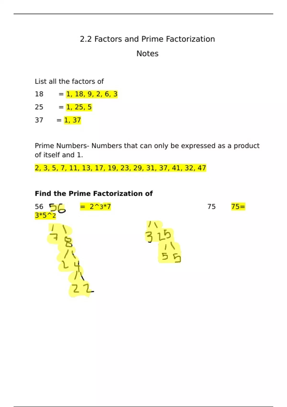 Notes taken of 2.2 Factors and Prime Factorization. With evaluations and answers.