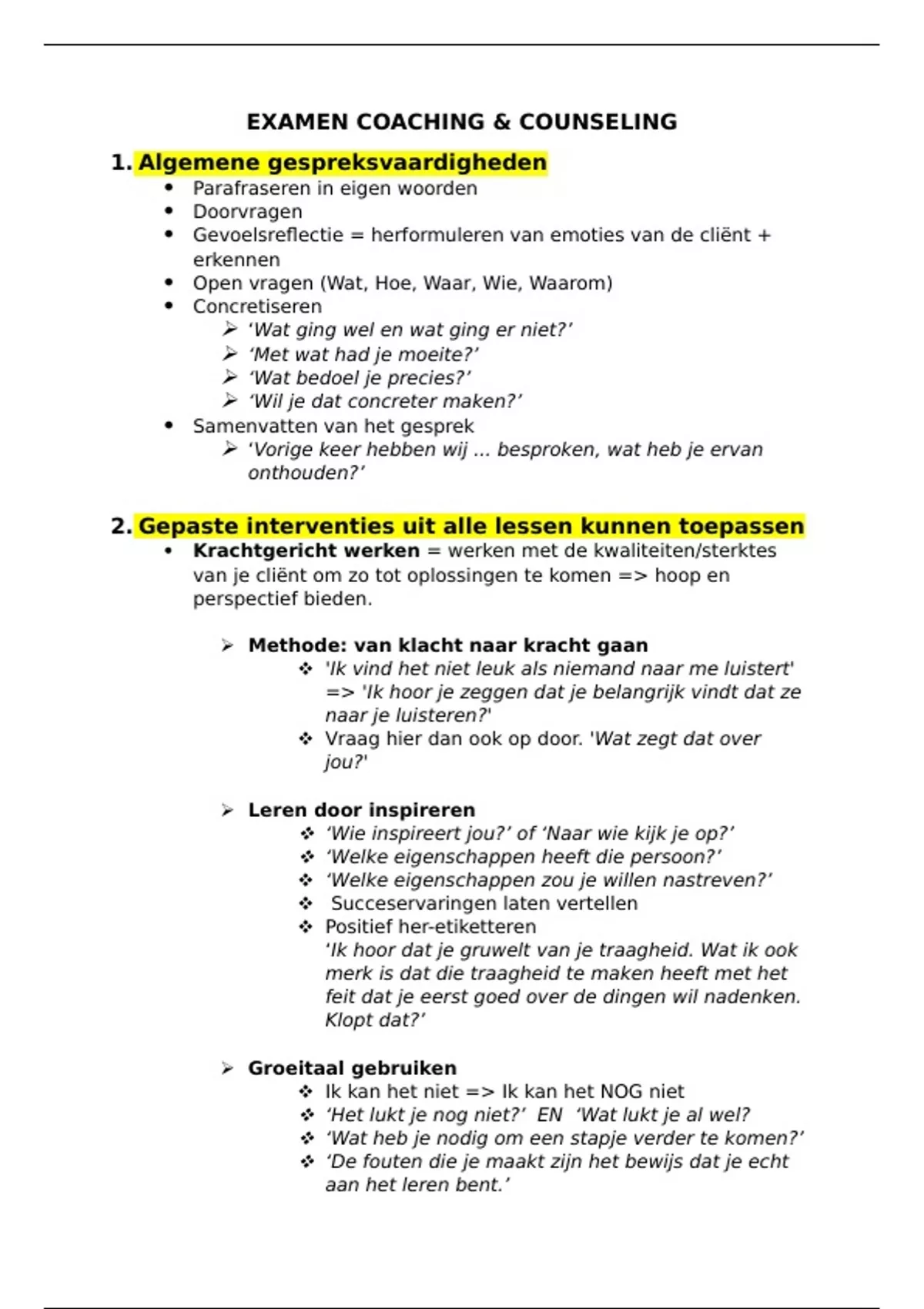 Samenvatting van het vak coaching en counseling in de richting Toegepaste Psychologie aan AP Hogeschool. Samenvatting is gebaseerd op de powerpoints, extra leermateriaal op digitap en de leerdoelen voor het mondeling examen. Met deze samenvatting een 13/20 gehaald.