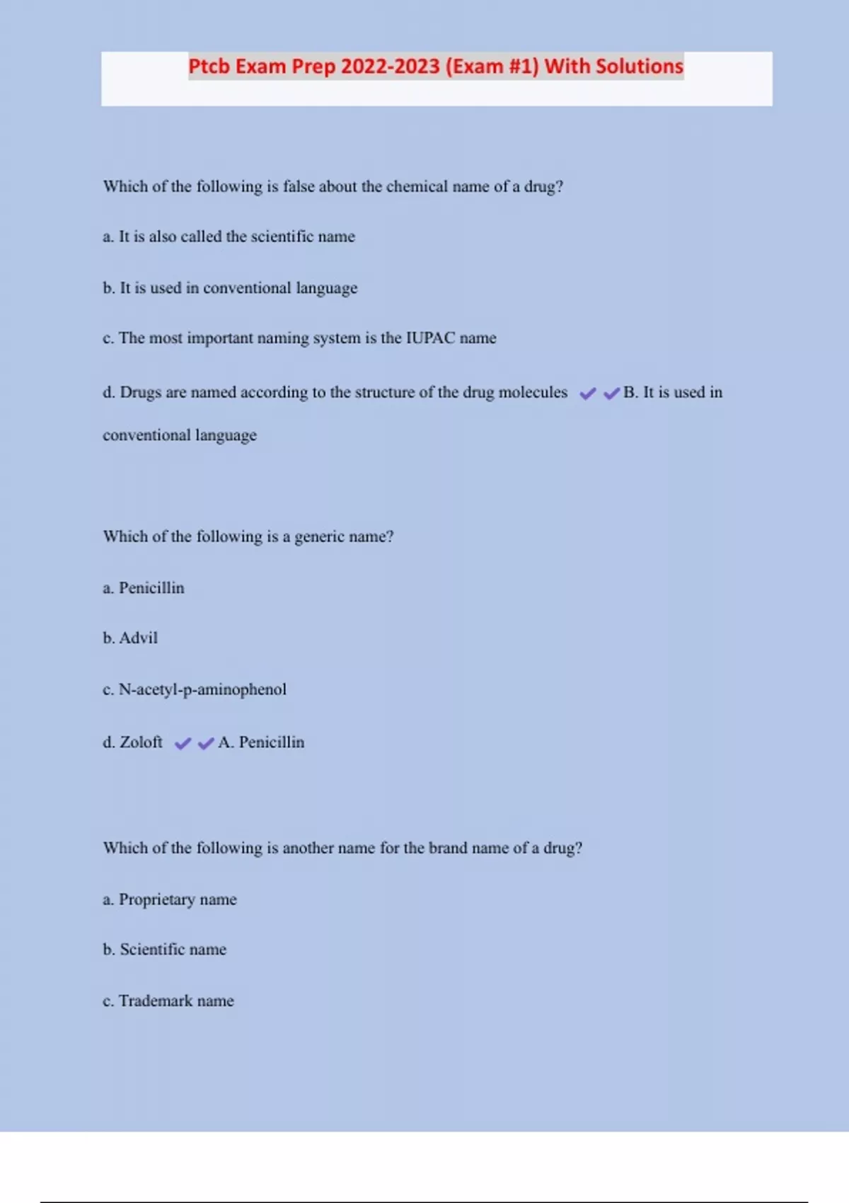 Ptcb Exam Prep (Exam #1) With Solutions Which of the following is false about the chemical name of a drug? a. It is also called the scientific name b. It is used in conventional language c. The most important naming system is the IUPAC name d. Drugs are named according to the structure of the drug molecules B. It is used in conventional language Which of the following is a generic name? a. Penicillin b. Advil c. N-acetyl-p-aminophenol d. Zoloft A. Penicillin