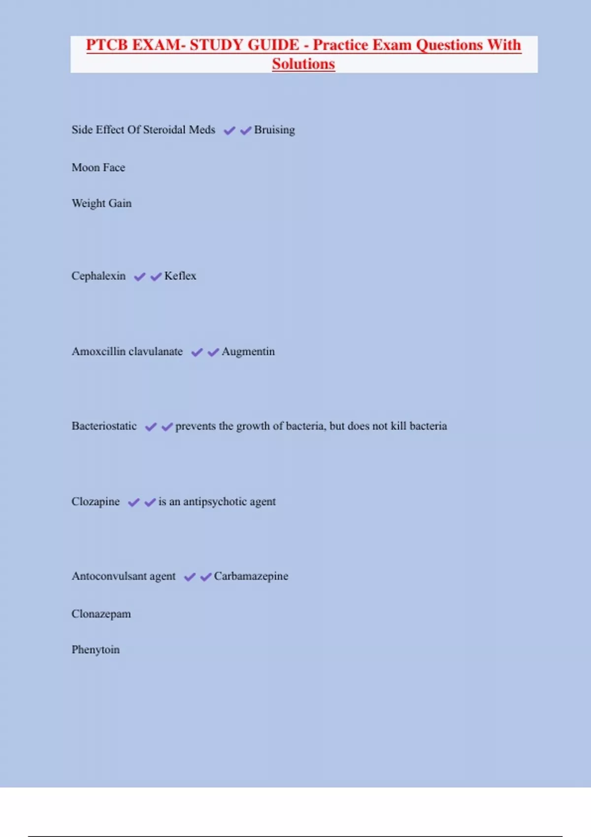 PTCB EXAM- STUDY GUIDE - Practice Exam Questions With Solutions Side Effect Of Steroidal Meds Bruising Moon Face Weight Gain Cephalexin Keflex Amoxcillin clavulanate Augmentin Bacteriostatic prevents the growth of bacteria, but does not kill bacteria Clozapine is an antipsychotic agent