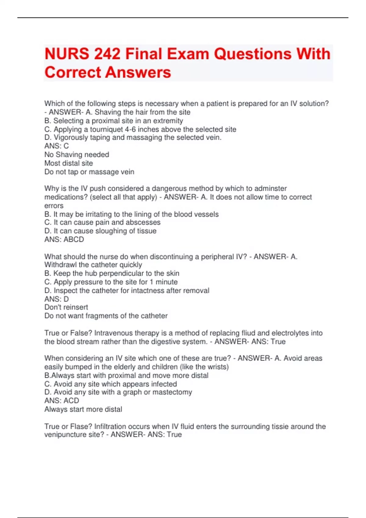 NURS 242 Final Exam Questions With Correct Answers Which of the following steps is necessary when a patient is prepared for an IV solution? - ANSWER- A. Shaving the hair from the site B. Selecting a proximal site in an extremity C. Applying a tourniquet 4-6 inches above the selected site D. Vigorously taping and massaging the selected vein. ANS: C No Shaving needed Most distal site Do not tap or massage vein Why is the IV push considered a dangerous method by which to adminster medications? (select all that apply) - ANSWER- A. It does not allow time to correct errors B. It may be irritating to the lining of the blood vessels C. It can cause pain and abscesses D. It can cause sloughing of tissue ANS: ABCD What should the nurse do when discontinuing a peripheral IV? - ANSWER- A. Withdrawl the catheter quickly B. Keep the hub perpendicular to the skin C. Apply pressure to the site for 1 minute D. Inspect the catheter for intactness after removal ANS: D Don't reinsert Do not want fragments of the catheter True or False? Intravenous therapy is a method of replacing fliud and electrolytes into the blood stream rather than the digestive system. - ANSWER- ANS: True When considering an IV site which one of these are true? - ANSWER- A. Avoid areas easily bumped in the elderly and children (like the wrists) B.Always start with proximal and move more distal C. Avoid any site which appears infected D. Avoid any site with a graph or mastectomy ANS: ACD Always start more distal True or Flase? Infiltration occurs when IV fluid enters the surrounding tissie around the venipuncture site? - ANSWER- ANS: True In order to discontinue an IV line, the nurse should obtain which item from the supply area for applying pressure to the site after removing an IV catheter? - ANSWER- A. Elastic wrap B. Betadine swab C. Adhesive bandage D. Sterile 2x2 gauze ANS: D Only one that makes sense because this applys pressure and getting any blood from removing What is the best size of IV? - ANSWER- A. The largest one you can feel comfortably insert in the patient B. The smallest you can find C. The smallest gauge to accomplish therapy D. The largest gauge your facility has. ANS: C because you want the medication to flow as fast as it can with still being in catheter proameters