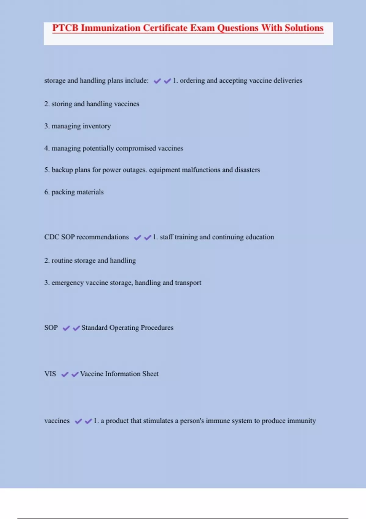 PTCB Immunization Certificate Exam Questions With Solutions storage and handling plans include: 1. ordering and accepting vaccine deliveries 2. storing and handling vaccines 3. managing inventory 4. managing potentially compromised vaccines 5. backup plans for power outages. equipment malfunctions and disasters 6. packing materials CDC SOP recommendations 1. staff training and continuing education 2. routine storage and handling 3. emergency vaccine storage, handling and transport