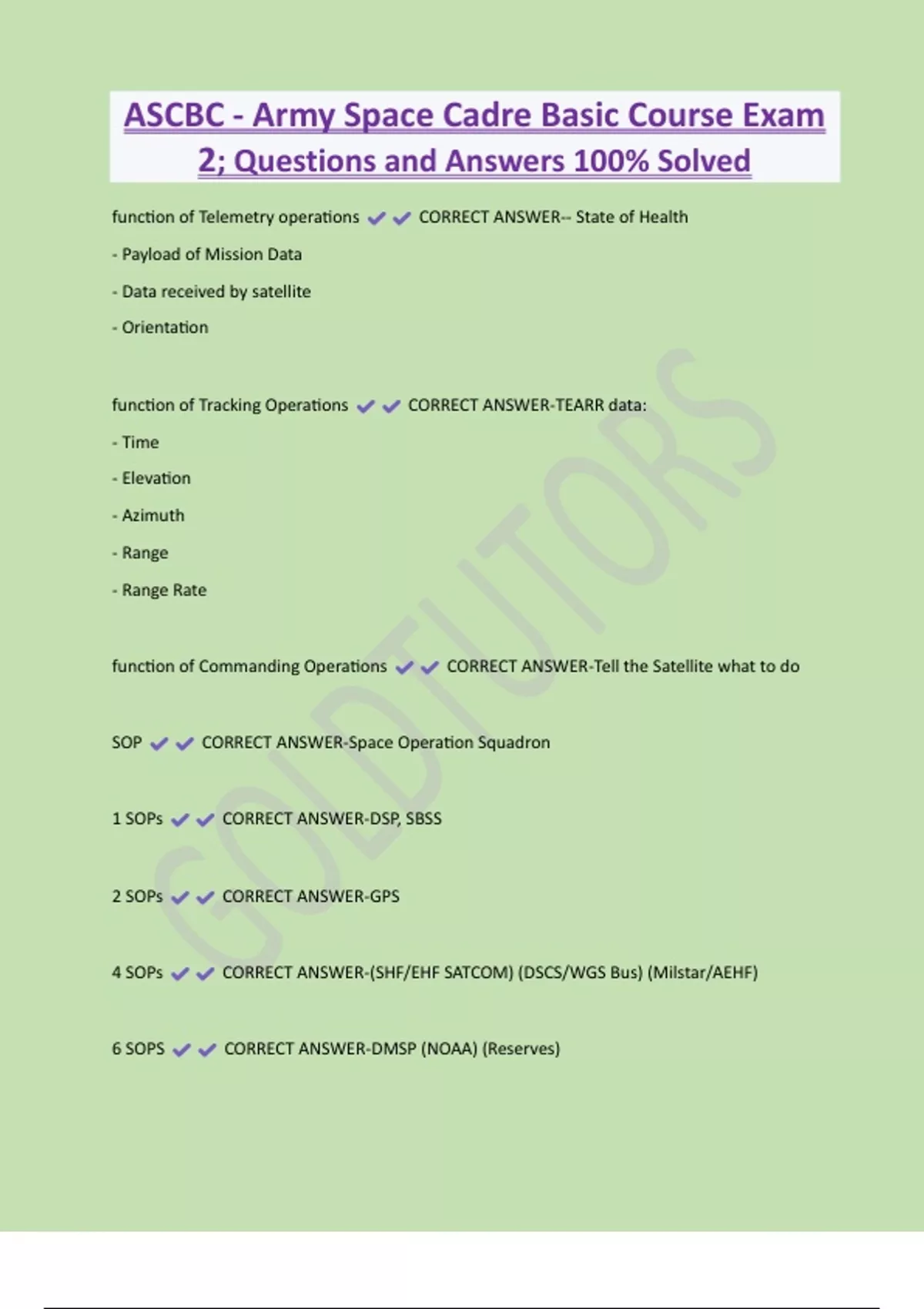 ASCBC - Army Space Cadre Basic Course Exam 2; Questions and Answers 100% Solved function of Telemetry operations CORRECT ANSWER-- State of Health - Payload of Mission Data - Data received by satellite - Orientation function of Tracking Operations CORRECT ANSWER-TEARR data: - Time - Elevation - Azimuth - Range - Range Rat