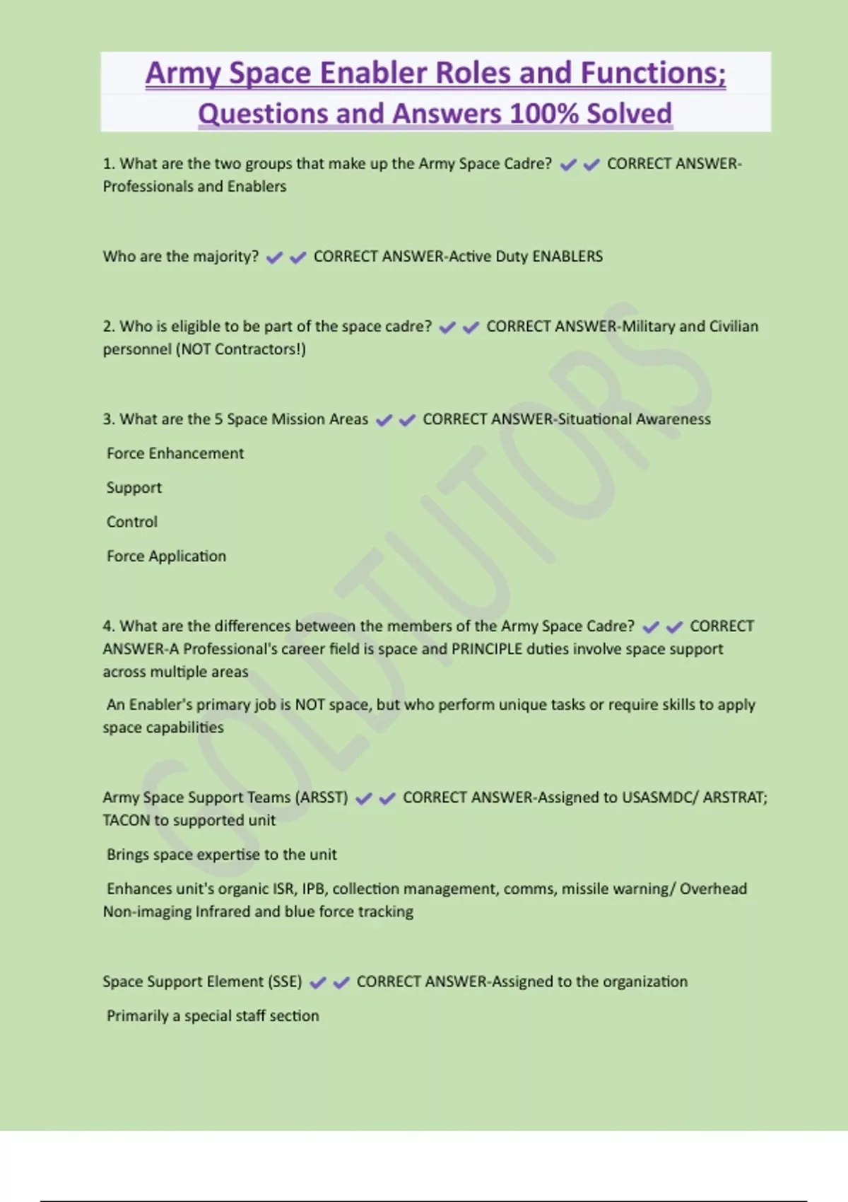 Army Space Enabler Roles and Functions; Questions and Answers 100% Solved 1. What are the two groups that make up the Army Space Cadre? CORRECT ANSWERProfessionals and Enablers Who are the majority? CORRECT ANSWER-Active Duty ENABLERS 2. Who is eligible to be part of the space cadre? CORRECT ANSWER-Military and Civilian personnel (NOT Contractors!) 3. What are the 5 Space Mission Areas CORRECT ANSWER-Situational Awareness Force Enhancement Support Control Force Application