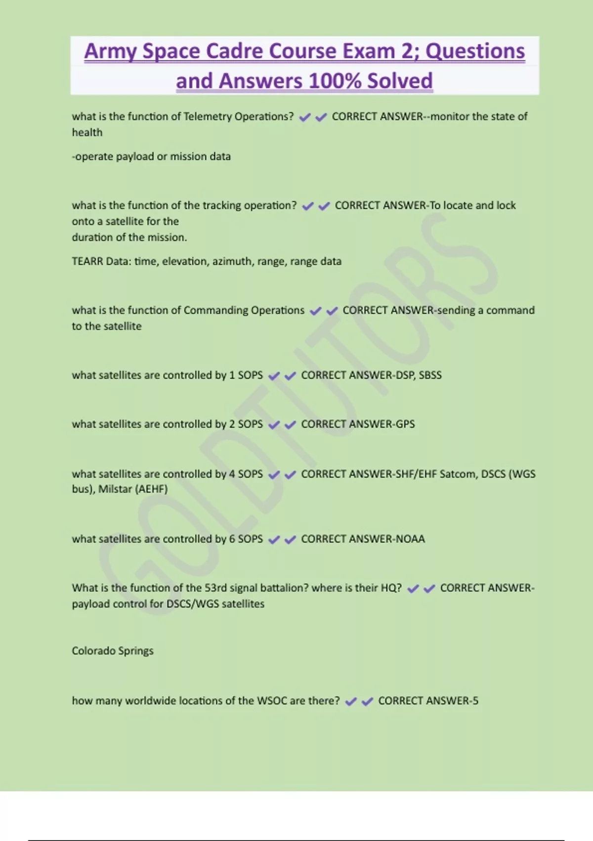 Army Space Cadre Course Exam 2; Questions and Answers 100% Solved what is the function of Telemetry Operations? CORRECT ANSWER--monitor the state of health -operate payload or mission data what is the function of the tracking operation? CORRECT ANSWER-To locate and lock onto a satellite for the duration of the mission. TEARR Data: time, elevation, azimuth, range, range data what is the function of Commanding Operations CORRECT ANSWER-sending a command to the satellite