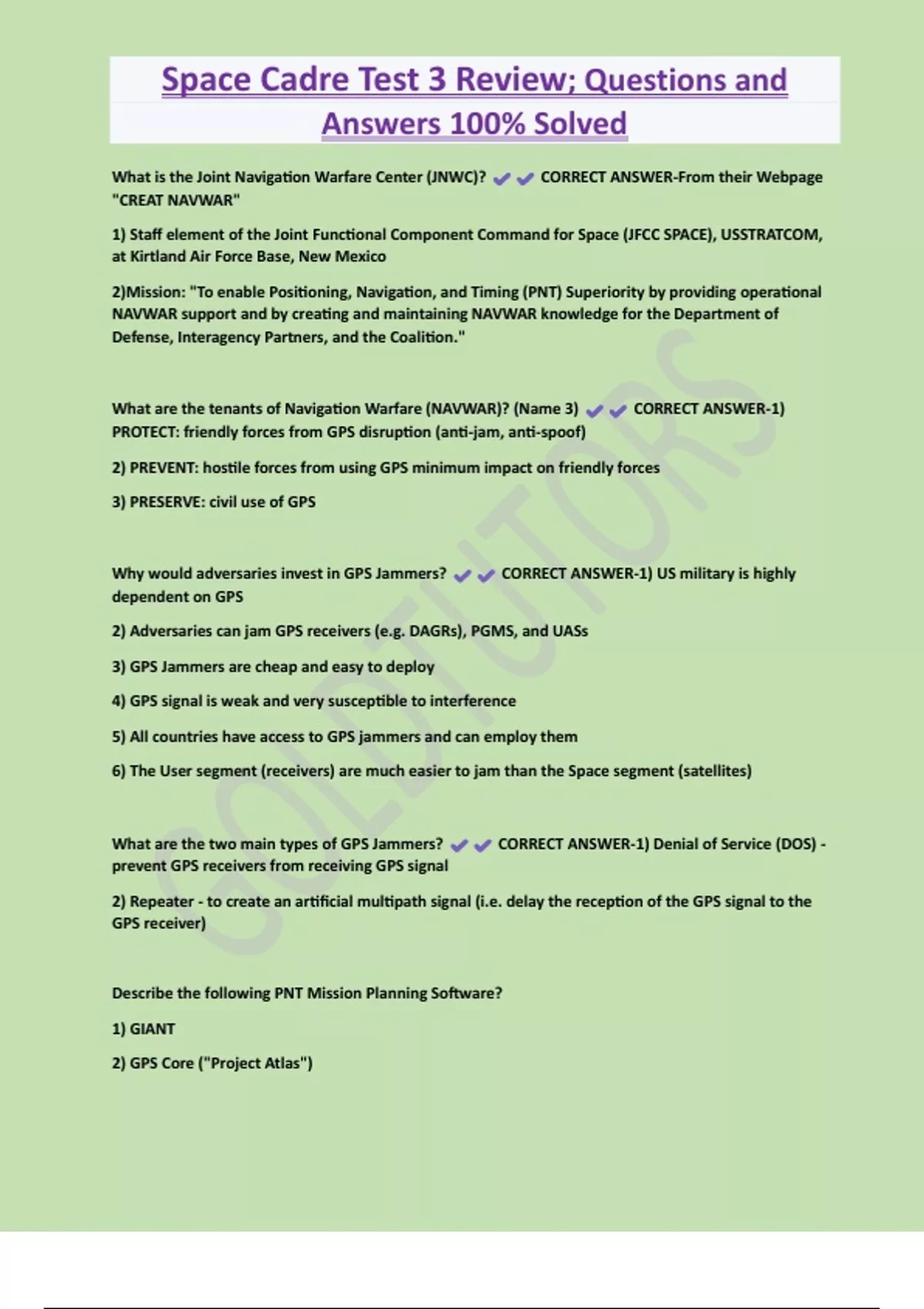 Space Cadre Test 3 Review; Questions and Answers 100% Solved What is the Joint Navigation Warfare Center (JNWC)? CORRECT ANSWER-From their Webpage "CREAT NAVWAR" 1) Staff element of the Joint Functional Component Command for Space (JFCC SPACE), USSTRATCOM, at Kirtland Air Force Base, New Mexico 2)Mission: "To enable Positioning, Navigation, and Timing (PNT) Superiority by providing operational NAVWAR support and by creating and maintaining NAVWAR knowledge for the Department of Defense, Interagency Partners, and the Coalition."