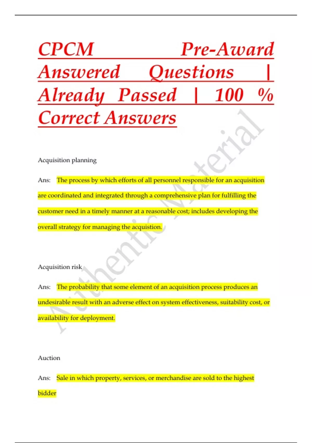 CPCM Pre-Award Answered Questions | Already Passed | 100 % Correct Answers