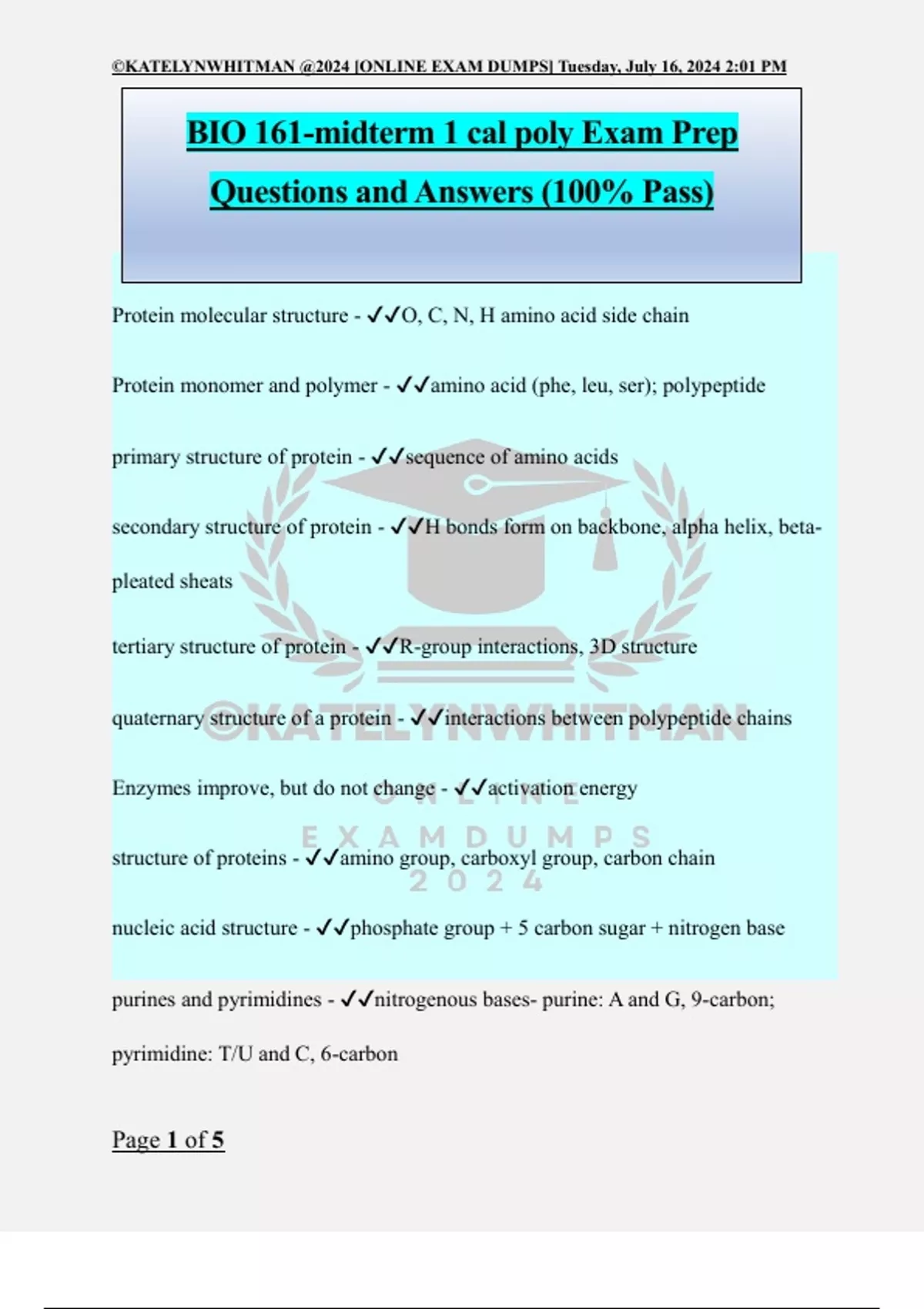 BIO 161-midterm 1 cal poly Exam Prep Questions and Answers (100% Pass)