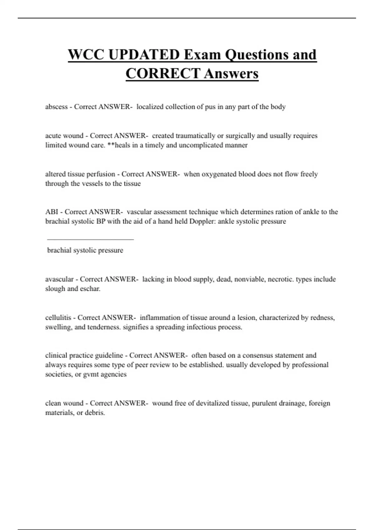 WCC UPDATED Exam Questions and CORRECT Answers abscess - Correct ANSWER- localized collection of pus in any part of the body acute wound - Correct ANSWER- created traumatically or surgically and usually requires limited wound care. **heals in a timely and uncomplicated manner altered tissue perfusion - Correct ANSWER- when oxygenated blood does not flow freely through the vessels to the tissue