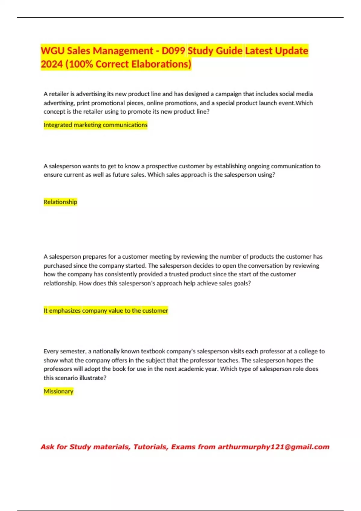 WGU Sales Management - D099 Study Guide Latest Update 2024 (100% Correct Elaborations)