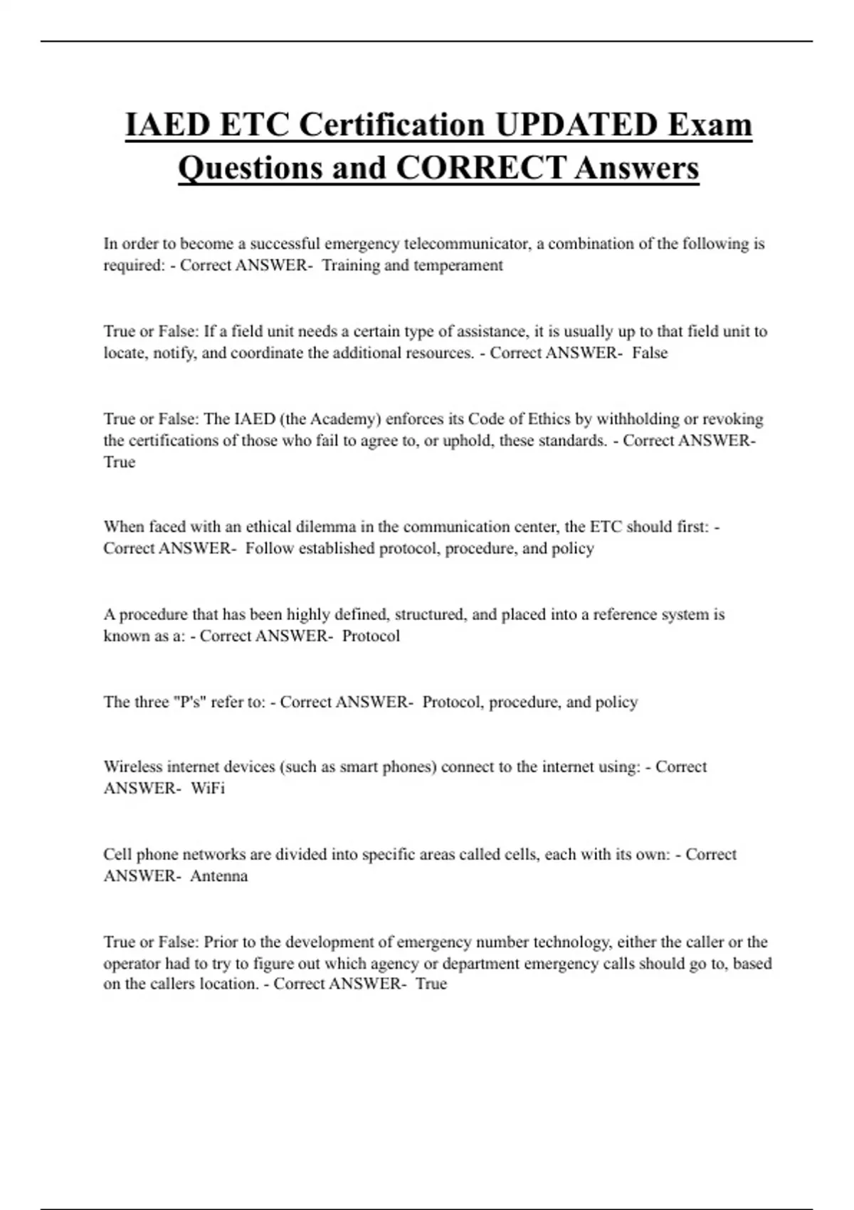 IAED ETC Certification UPDATED Exam Questions and CORRECT Answers In order to become a successful emergency telecommunicator, a combination of the following is required: - Correct ANSWER- Training and temperament True or False: If a field unit needs a certain type of assistance, it is usually up to that field unit to locate, notify, and coordinate the additional resources. - Correct ANSWER- False True or False: The IAED (the Academy) enforces its Code of Ethics by withholding or revoking the certifications of those who fail to agree to, or uphold, these standards. - Correct ANSWERTrue