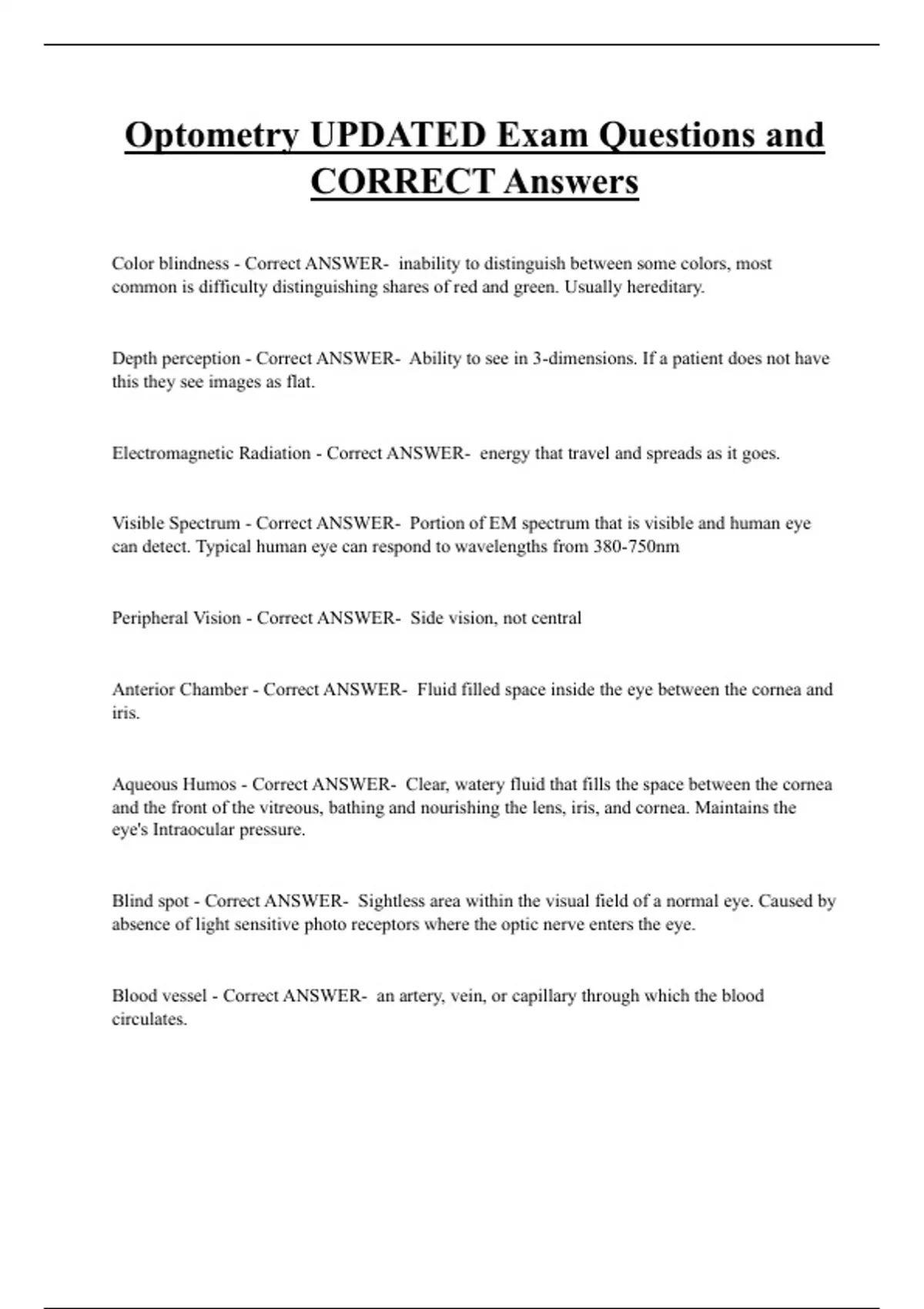 Optometry UPDATED Exam Questions and CORRECT Answers Color blindness - Correct ANSWER- inability to distinguish between some colors, most common is difficulty distinguishing shares of red and green. Usually hereditary. Depth perception - Correct ANSWER- Ability to see in 3-dimensions. If a patient does not have this they see images as flat. Electromagnetic Radiation - Correct ANSWER- energy that travel and spreads as it goes. Visible Spectrum - Correct ANSWER- Portion of EM spectrum that is visible and human eye can detect. Typical human eye can respond to wavelengths from 380-750nm