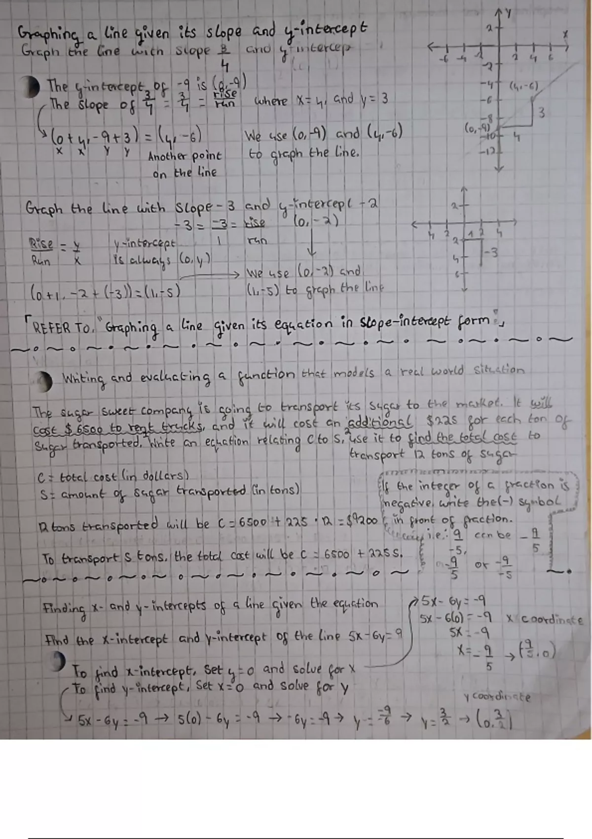 Graphing a line given its slope and y-intercept | Writing and evaluating a function that models a real world situation | Finding x- and y- intercepts of a line given the equation