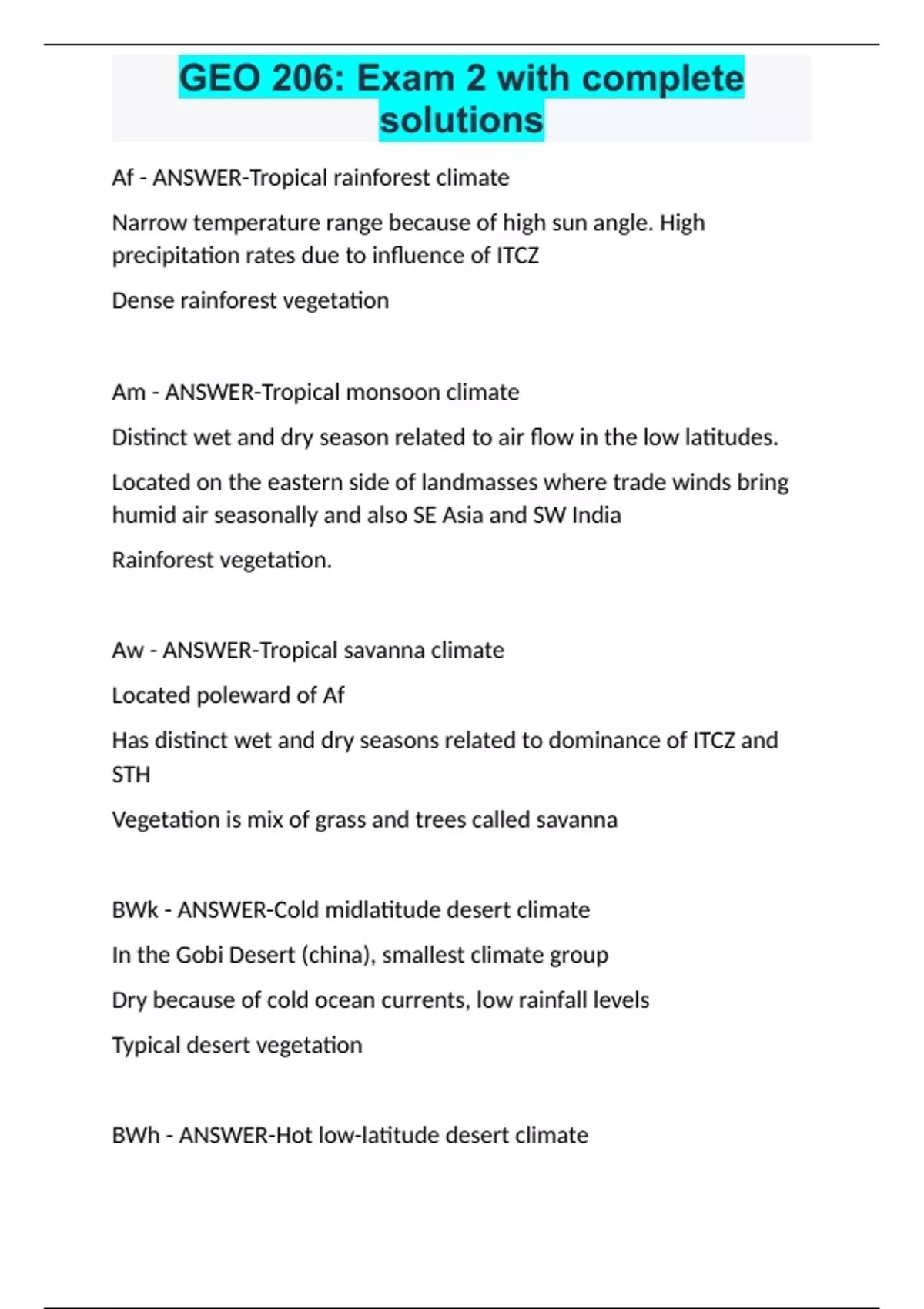 Af Tropical rainforest climate Narrow temperature range because of high sun angle. High precipitation rates due to influence of ITCZ Dense rainforest vegetation Am Tropical monsoon climate Distinct wet and dry season related to air flow in the low latitudes. Located on the eastern side of landmasses where trade winds bring humid air seasonally and also SE Asia and SW India Rainforest vegetation. 0:49 / 0:54 6 Ways to Show Appreciation for Your Child's Teacher Aw Tropical savanna climate Located poleward of Af Has distinct wet and dry seasons related to dominance of ITCZ and STH Vegetation is mix of grass and trees called savanna BWk Cold midlatitude desert climate In the Gobi Desert (china), smallest climate group Dry because of cold ocean currents, low rainfall levels Typical desert vegetation BWh Hot low-latitude desert climate Found in the center and eastern sides of STH (15 to 30 latitude in SH and NH) Hot because of little clouds and high sun angle, very little rainfall Vegetation is sparse Cfb Marine west-coast climates Located on the west coast of continents (btwn 35 to 60 latitude N and S) Wider temperature range that's cooler, receive a lot of rainfall Vegetation is needle-leaf trees Dfa Humid continental hot-summer climates Located in central and eastern parts of NA and Eurasia Moist with a lot of rainfall each month. temperature ranges from warm summers to cold winters Influenced by the midlatitude jet stream Tropical Rainforest Biome Located in the equatorial region Associated with small with Af zone and small areas of Am - limited dry season. Wide array of vegetation, trees experience no seasonal leaf fall because of the constant high temps and moisture (evergreen) Consists of four vertical layers: emergent layer, canopy, understory, and the ground layer Tropical Deciduous Forest Biome In Africa, South America, India and SE Asia. Dry tropical areas with distinct dry seasons in Am and Aw Temperature varies but is always above 64F Wet areas dominated by deciduous forest, the trees drop their leaves in the dry season Less species diversity than the rainforest but has a great array of shrub species and smaller ground level plants Tropical scrub in areas with lower rainfall Midlatitude Coniferous Forest Biome West coast and mountains of NA, SE united states, and eastern Europe Needle-leaf evergreen trees Humid continental mild-summer climate with short growing seasons occurring at low latitudes and high elevations where temperature is cool - "temperate rainforest" SE coniferous forest is hot and humid, high biodiversity Hot and Dry Desert Biome Located in the subtropical region, centered on 30 latitude associated with BWh Mojave, Kalahari, Sahara and Sonoran deserts are in this biome Low annual precipitation and high average temperature, moisture deficit Vegetation is xerophytic plants (cacti, shrubs, scattered grass) that are drought resistant...also drought evading plants Semi-Arid and Cold Desert Biome Western NA and central Asia associated with BWk Distinct seasonal temperature patterns with hot, dry summers and cold winters Vegetation is sparse plants that have glossy leaves that give them a higher albedo helping to reflect radiation Alfisols Form by podzolization (occurs in cool, humid environments resulting in elevation of iron, aluminum and organic acids) which create a well-developed E and B horizon Have a distinct O horizon and A horizon Occur in warmer regions where the litter consists of deciduous leaves Distinct light E horizon Ultisols Form in warm, moist, subtropic