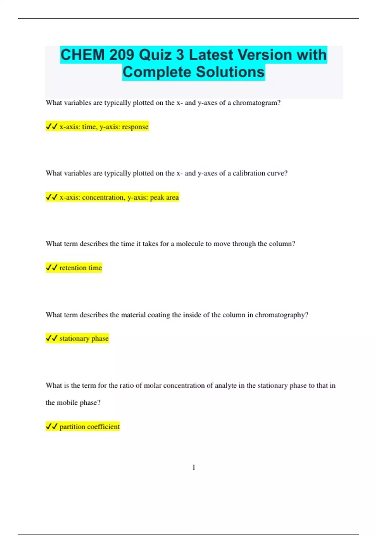 CHEM 209 Quiz 3 Latest Version with Complete Solutions What variables are typically plotted on the x- and y-axes of a chromatogram? x-axis: time, y-axis: response What variables are typically plotted on the x- and y-axes of a calibration curve? x-axis: concentration, y-axis: peak area What term describes the time it takes for a molecule to move through the column? retention time What term describes the material coating the inside of the column in chromatography? stationary phase What is the term for the ratio of molar concentration of analyte in the stationary phase to that in the mobile phase? partition coefficient 2 What is another term for the mobile phase in chromatography? carrier gas Typically, will an increase in operating temperature or mobile phase flow rate result in longer or shorter retention times for chromatographic peaks? shorter Why does an increase in operating temperature or mobile phase flow rate generally lead to shorter retention times for chromatographic peaks? Faster flow through the column If you need to decrease the retention times of peaks in a chromatogram, what are three specific GC conditions you could modify? oven temperature, mobile phase flow rate, column length In a GC experiment, a student injects 2.0 μL of a 20% ethanol/water solution. Calculate the weight of ethanol injected. (Ethanol density: 0.789 g/mL at 20°C) 0.3156 mg