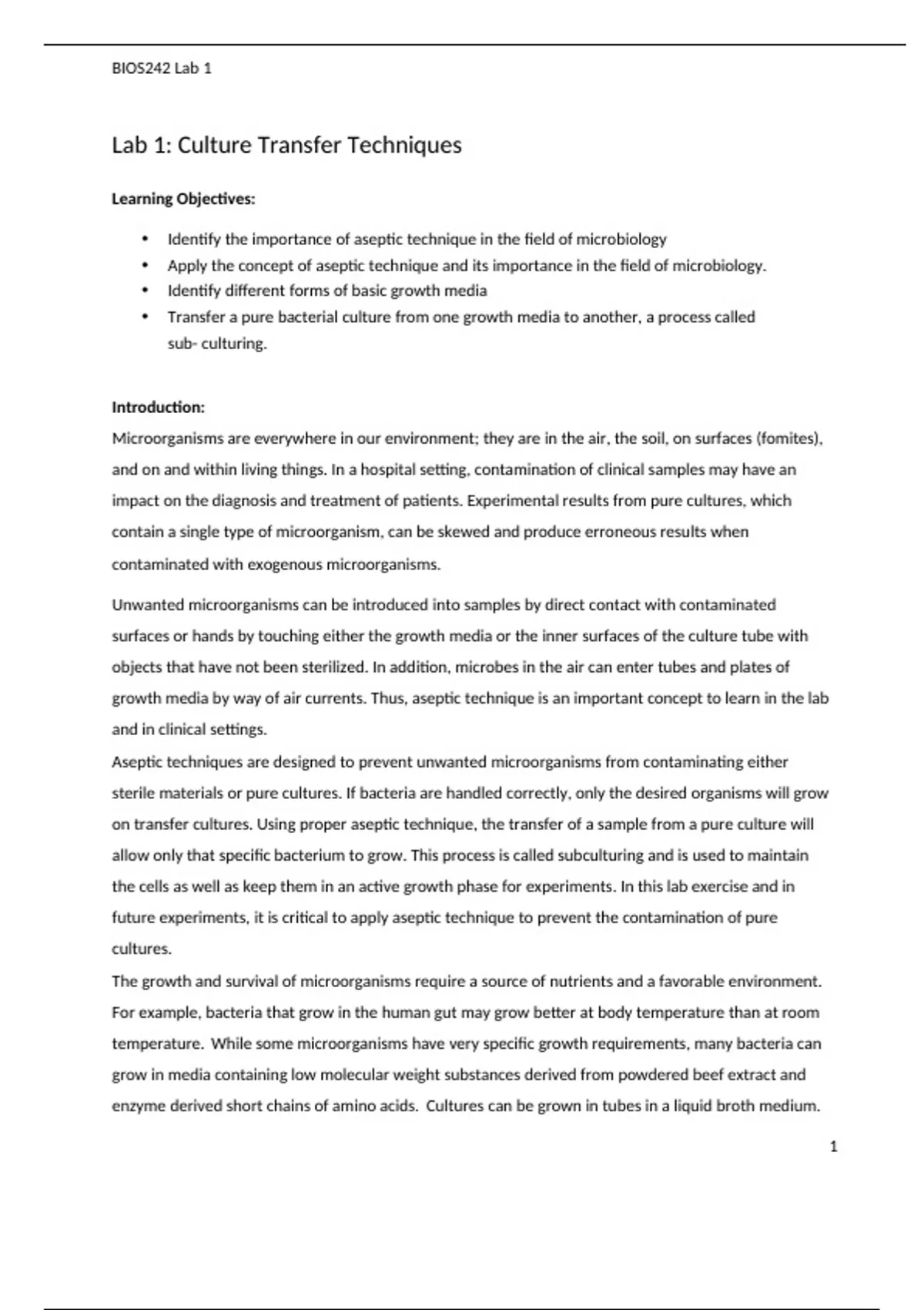 BIOS 242 Week 1 Assignment; Lab 1 of 14 Onsite - Culture Transfer Techniques