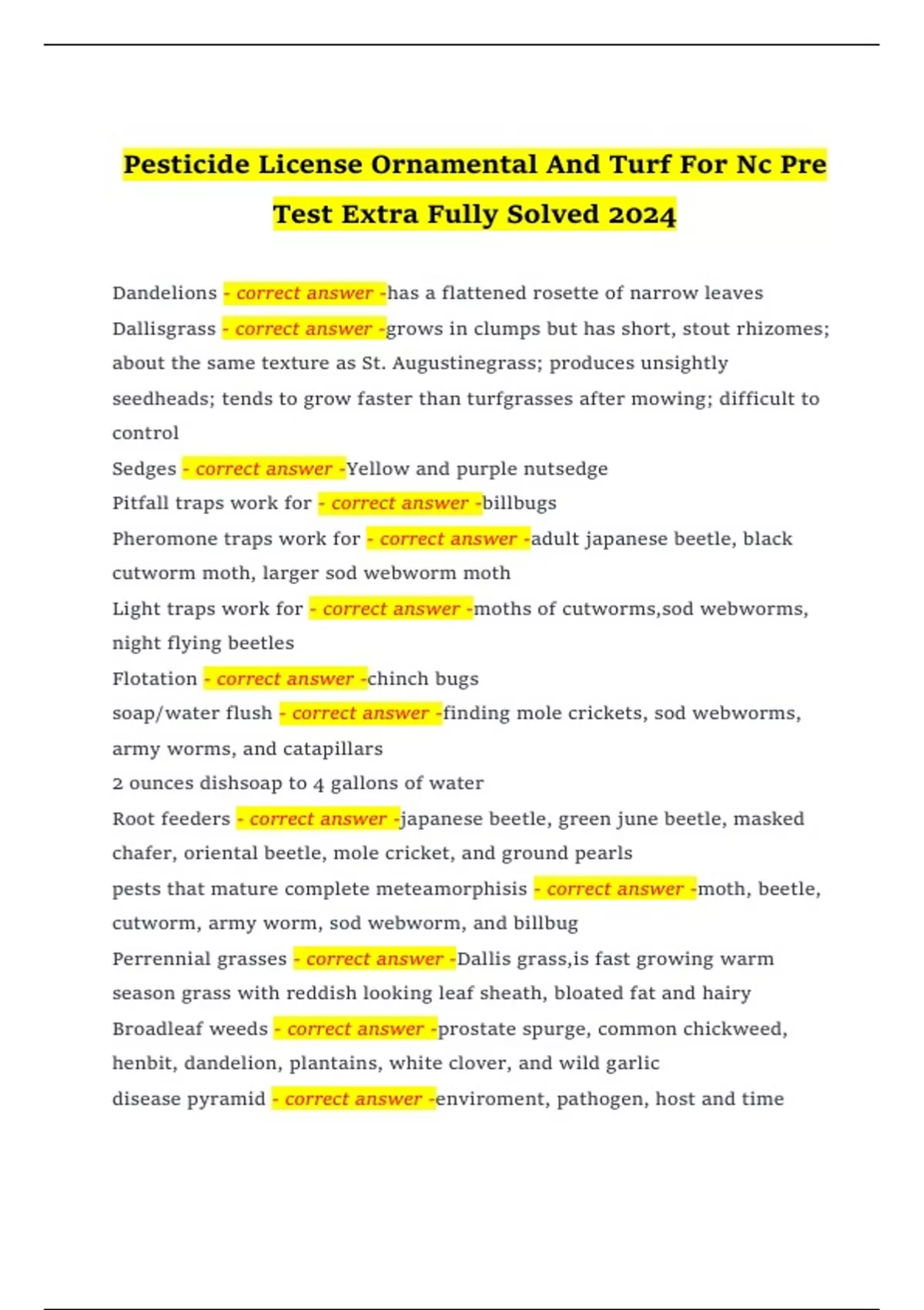 Pesticide License Ornamental And Turf For Nc Pre Test Extra Fully Solved 2024 Dandelions - correct answer -has a flattened rosette of narrow leaves Dallisgrass - correct answer -grows in clumps but has short, stout rhizomes; about the same texture as St. Augustinegrass; produces unsightly seedheads; tends to grow faster than turfgrasses after mowing; difficult to control Sedges - correct answer -Yellow and purple nutsedge Pitfall traps work for - correct answer -billbugs