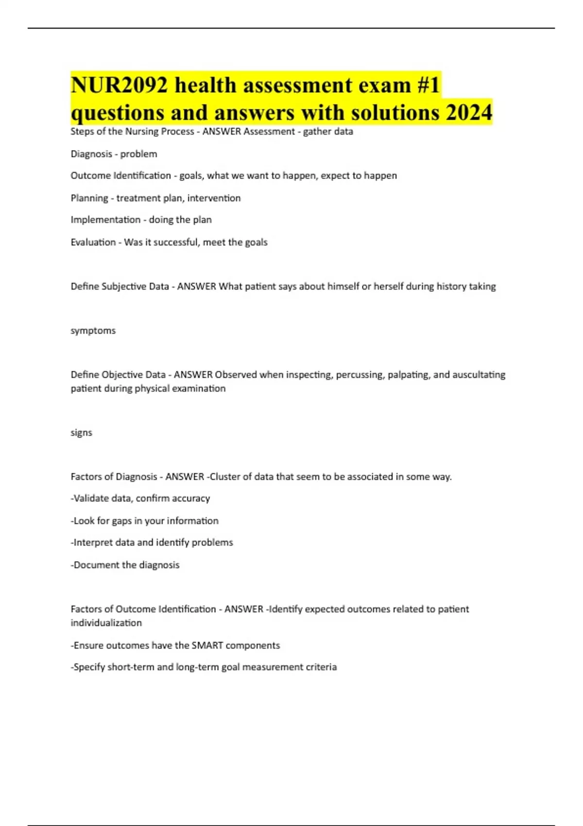 NUR2092 health assessment exam #1 questions and answers with solutions 2024