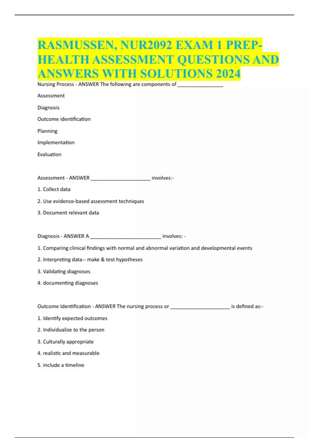 RASMUSSEN, NUR2092 EXAM 1 PREP-HEALTH ASSESSMENT QUESTIONS AND ANSWERS WITH SOLUTIONS 2024