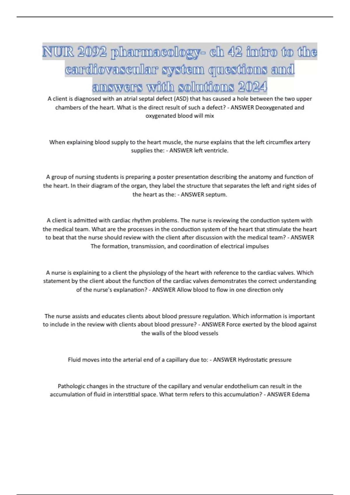 NUR 2092 pharmacology- ch 42 intro to the cardiovascular system questions and answers with solutions 2024