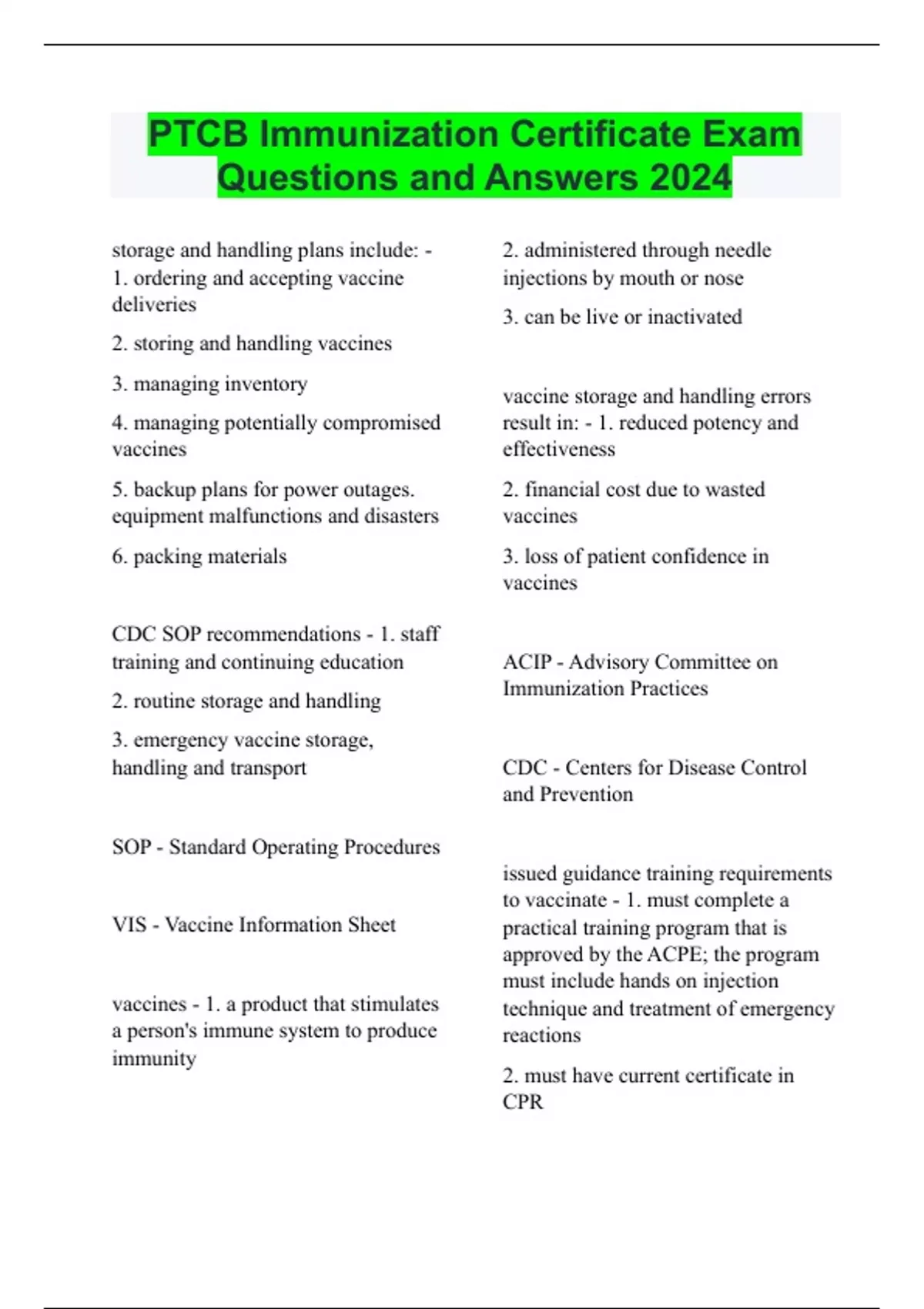 storage and handling plans include: - 1. ordering and accepting vaccine deliveries 2. storing and handling vaccines 3. managing inventory 4. managing potentially compromised vaccines 5. backup plans for power outages. equipment malfunctions and disasters 6. packing materials CDC SOP recommendations - 1. staff training and continuing education 2. routine storage and handling 3. emergency vaccine storage, handling and transport SOP - Standard Operating Procedures VIS - Vaccine Information Sheet vaccines - 1. a product that stimulates a person's immune system to produce immunity 2. administered through needle injections by mouth or nose 3. can be live or inactivated vaccine storage and handling errors result in: - 1. reduced potency and effectiveness 2. financial cost due to wasted vaccines 3. loss of patient confidence in vaccines ACIP - Advisory Committee on Immunization Practices CDC - Centers for Disease Control and Prevention issued guidance training requirements to vaccinate - 1. must complete a practical training program that is approved by the ACPE; the program must include hands on injection technique and treatment of emergency reactions
