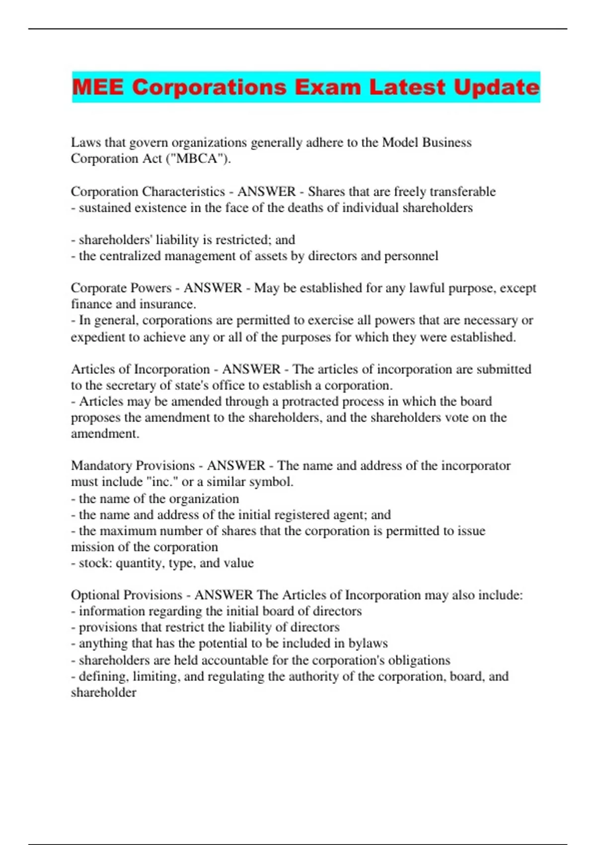 MEE Corporations Exam Latest Update Laws that govern organizations generally adhere to the Model Business Corporation Act ("MBCA"). Corporation Characteristics - ANSWER - Shares that are freely transferable - sustained existence in the face of the deaths of individual shareholder s - shareholders' liability is restricted; and - the centralized management of assets by directors and personnel Corporate Powers - ANSWER - May be established for any lawful purpose, except finance and insurance. - In general, corporations are permitted to exercise all powers that are necessary or expedient to achieve any or all of the purposes for which they were establishe d. Articles of Incorporation - ANSWER - The articles of incorporation are s ubmitted to the secretary of state's office to establish a corporation. - Articles may be amended through a protracted process in which the board proposes the amendment to the shareholders, and the shareholders vote on t he amendment . Mandatory Provisions - ANSWER - The name and address of the incorporator must include "inc." or a similar symbol. - the name of the organization - the name and address of the initial registered agent; and - the maximum number of shares that the corporation is permitted to issue mission of the corporation - stock: quantity, type, and value Optional Provisions - ANSWER The Articles of Incorporation may also include: - information regarding the initial board of directors - provisions that restrict the liability of directors - anything that has the potential to be included in bylaws - shareholders are held accountable for the corporation's obligations - defining, limiting, and regulating the authority of the corporatio n, board, and shareholder Initial Directors Appointed - ANSWER Directors must convene promptly to finalise the organisation of the corporation by: - the appointment of personnel - the adoption of ordinances - conducting any other business that was presented to the meeting In the event that the Articles of Incorporation do not specify the initial d irectors, the incorporators are obligated to convene a meeting at the request of a majorit y of the incorporators to either elect directors or elect a board of directors. Th e board of directors will subsequently complete the organisation of the corporat ion. The annual shareholder meeting is frequently specified in the bylaws, incl uding the time and location. - The record date for determining the shareholders who are eligible to vote at a meeting or receive dividends. - the minimum number of shareholders required to constitute a quorum - the percentage of votes required to authorise corporate action - any limitations on the transferability of the share. De jure corporations are those that are established in accordance with t he statute. In general, the commencement of corporate existence occurs when the Articles of Incorporation become effective. In general, a certified statement of the fact of incorporation by the state is regarded as evidence of "de jure" status. De Facto Corporation - ANSWER Corporation is not in statutory compliance; however, it is de facto if: - a sincere effort was made to adhere to the statute - the proprietors, in good faith, conducted themselves as thoug h they were a corporation (de facto corporations are today uncommon; however, they provide directors and shareholders with protection from liability, with the exception of the state.) Corporation by Estoppel - ANSWER If not de jure or de facto, it could still be a corporation by estoppel if: - The creditor consistently acted and thought as if he were interacting with a corporation. Additionally, D is unable to protect itself from liability by asserting that corp is not a legal entity if it falsely represented itself as a corporation. Ultra Vires Doctrine - ANSWER The Board of Directors is prohibited from taking any action that exceeds the authority of the corporation, as outlined in th e Articles