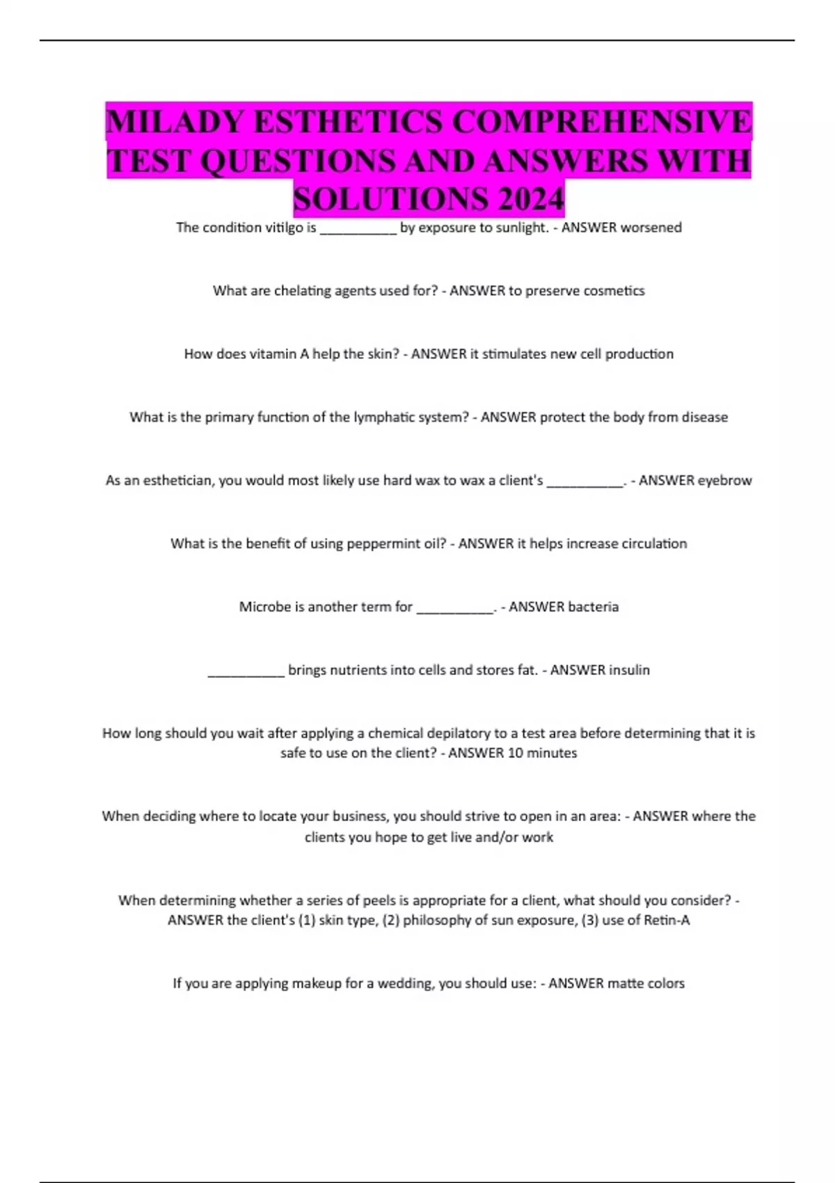 MILADY ESTHETICS COMPREHENSIVE TEST QUESTIONS AND ANSWERS WITH SOLUTIONS 2024