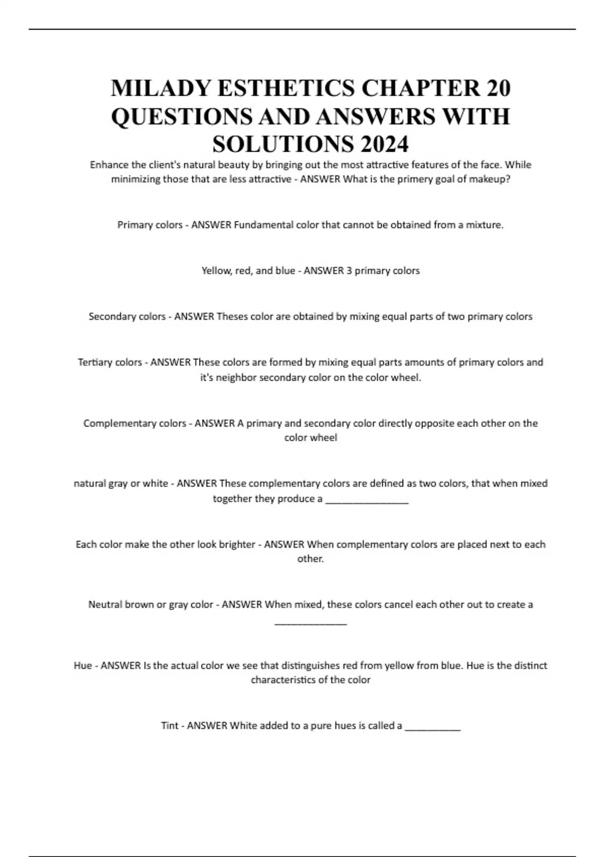 MILADY ESTHETICS CHAPTER 20 QUESTIONS AND ANSWERS WITH SOLUTIONS 2024