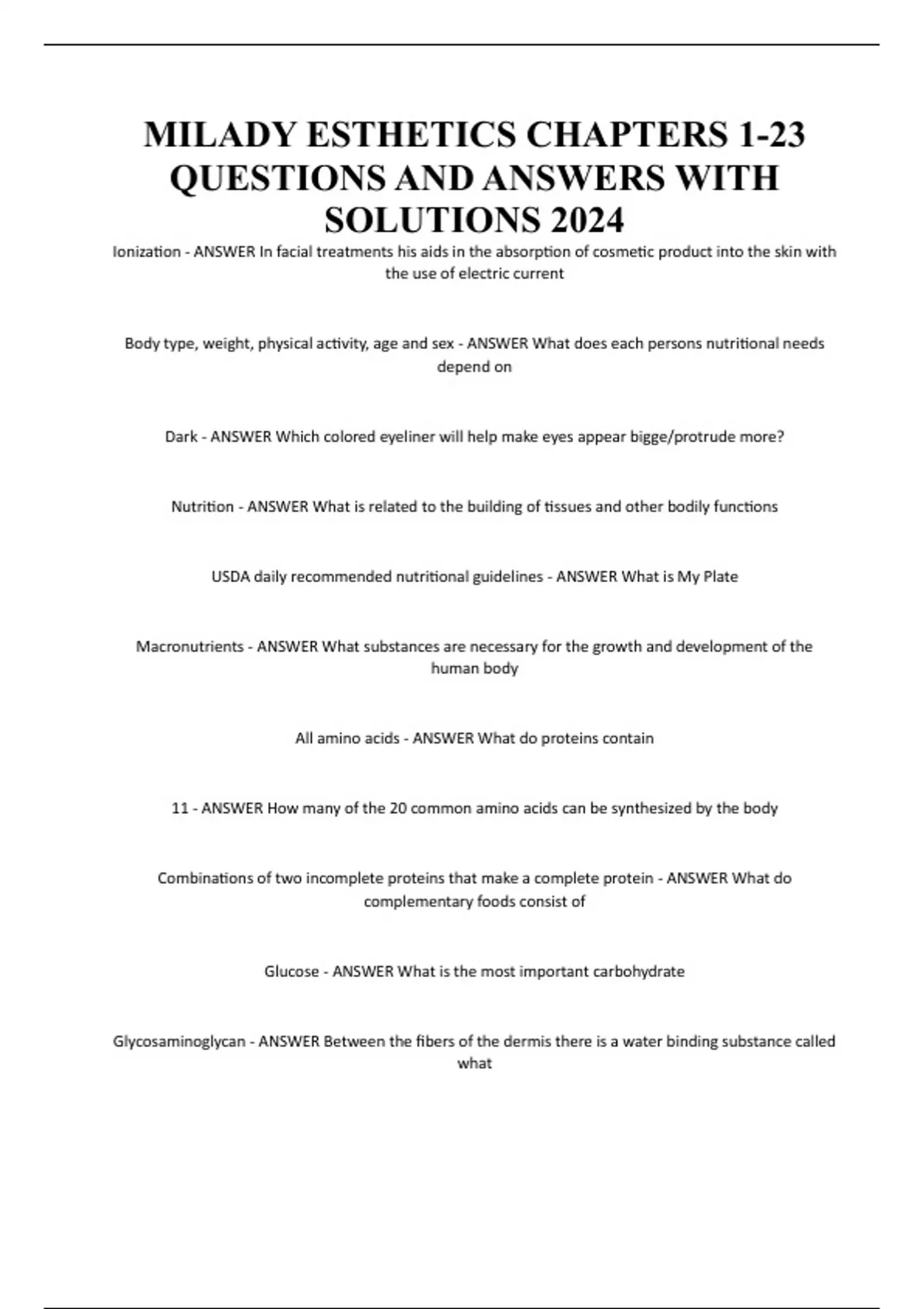 MILADY ESTHETICS CHAPTERS 1-23 QUESTIONS AND ANSWERS WITH SOLUTIONS 2024