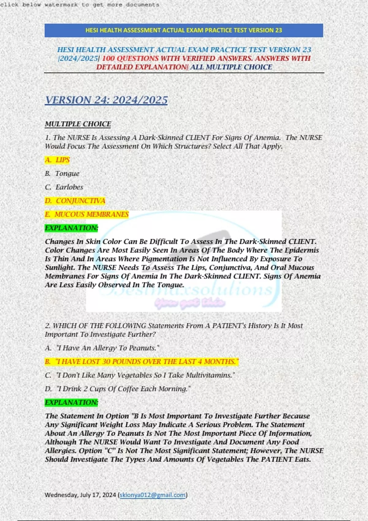 HESI HEALTH ASSESSMENT ACTUAL EXAM PRACTICE TEST VERSION 23 |2024/2025| 100 QUESTIONS WITH VERIFIED ANSWERS. ANSWERS WITH DETAILED EXPLANATION| ALL MULTIPLE CHOICE,HESI HEALTH ASSESSMENT ACTUAL EXAM PRACTICE TEST VERSION 23 |2024/2025| 100 QUESTIONS WITH VERIFIED ANSWERS. ANSWERS WITH DETAILED EXPLANATION| ALL MULTIPLE CHOICE,HESI HEALTH ASSESSMENT ACTUAL EXAM PRACTICE TEST VERSION 23 |2024/2025| 100 QUESTIONS WITH VERIFIED ANSWERS. ANSWERS WITH DETAILED EXPLANATION| ALL MULTIPLE CHOICE